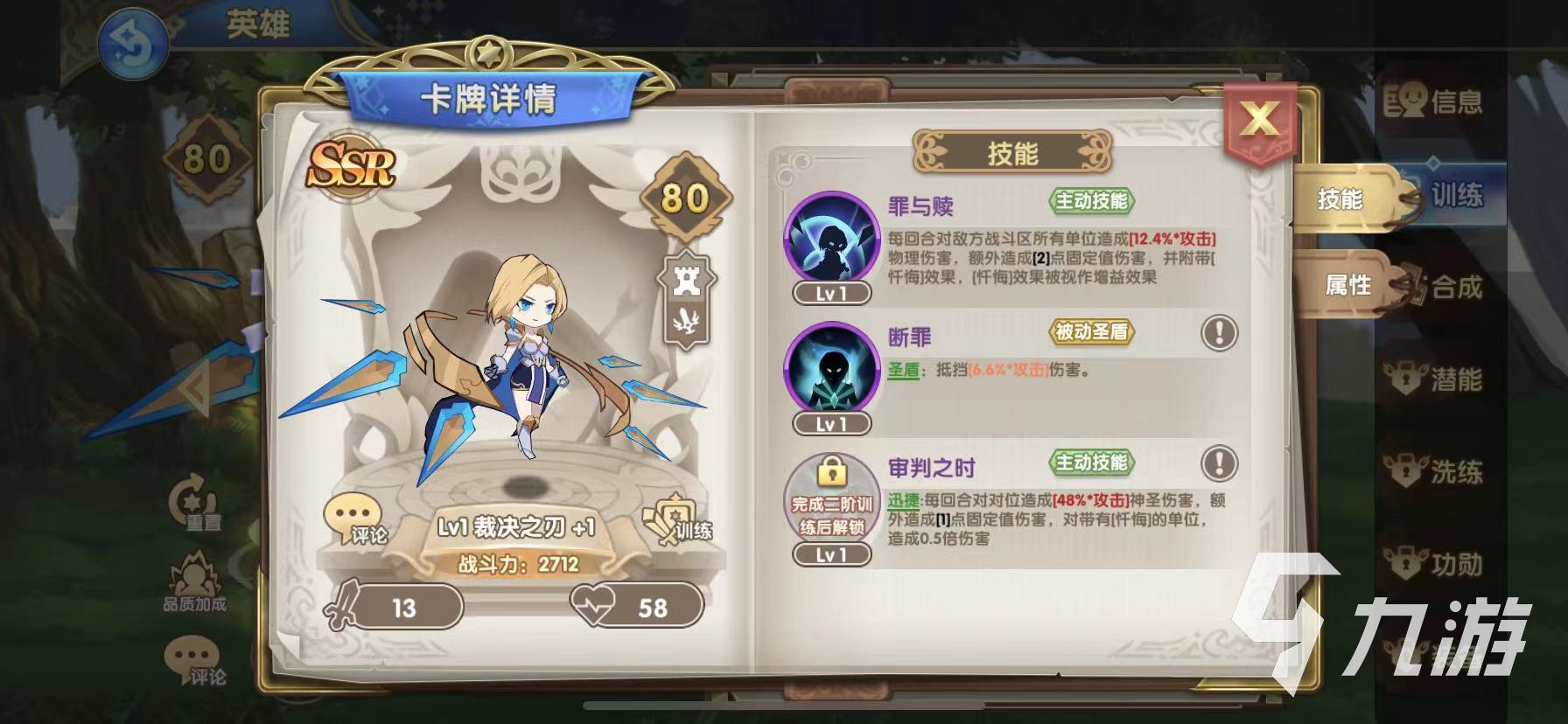 一技能罪與贖,屬于主動技能,在每回合釋放之后可對敵方戰(zhàn)斗區(qū)所有單位造成16%的物理傷害,并且額外造成一點固定傷害,附加懺悔效果,懺悔效果可以視為增益效果,幫助裁決之刃提升一定的戰(zhàn)力。