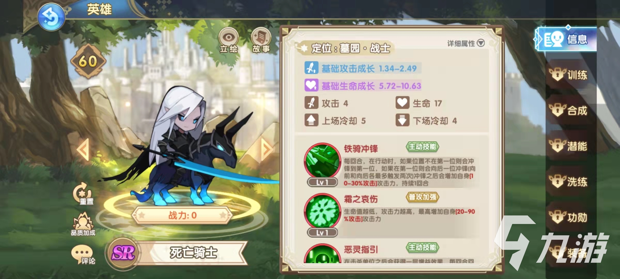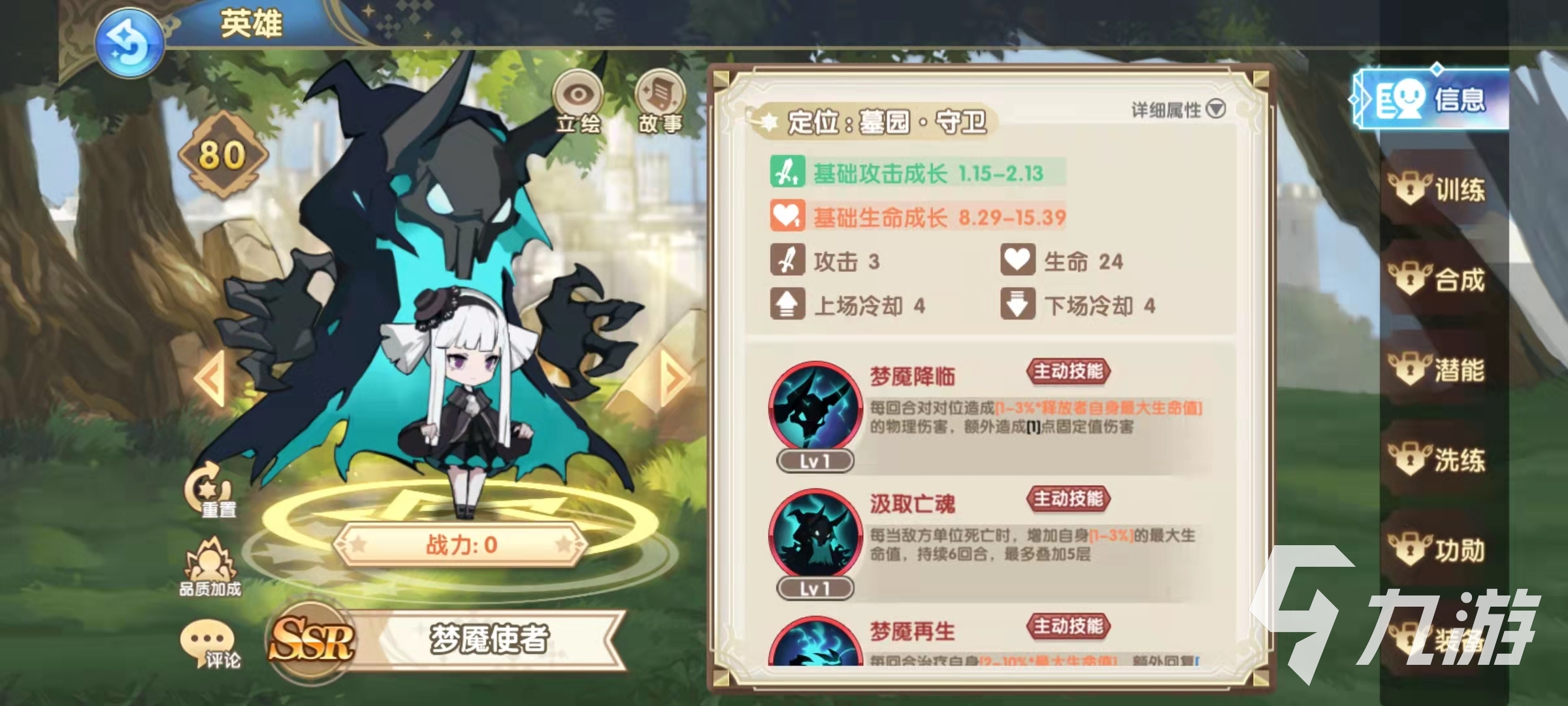 夢魘使者也是屬于SSR級別的卡牌,最大的特點是有三個主動技能,第一個主動技能夢魘降臨可以造成單體目標的傷害,主動技能汲取亡魂的效果是當敵方有單位死亡的時候,可以增加自身的生命值,并且可以疊加到五層。所以夢魘使者定位是守衛(wèi)角色是很合適的,在血量疊加起來之后,夢魘使者就很難被擊殺了。況且還有夢魘再生技能能夠治療自身,更加強化了生存能力。