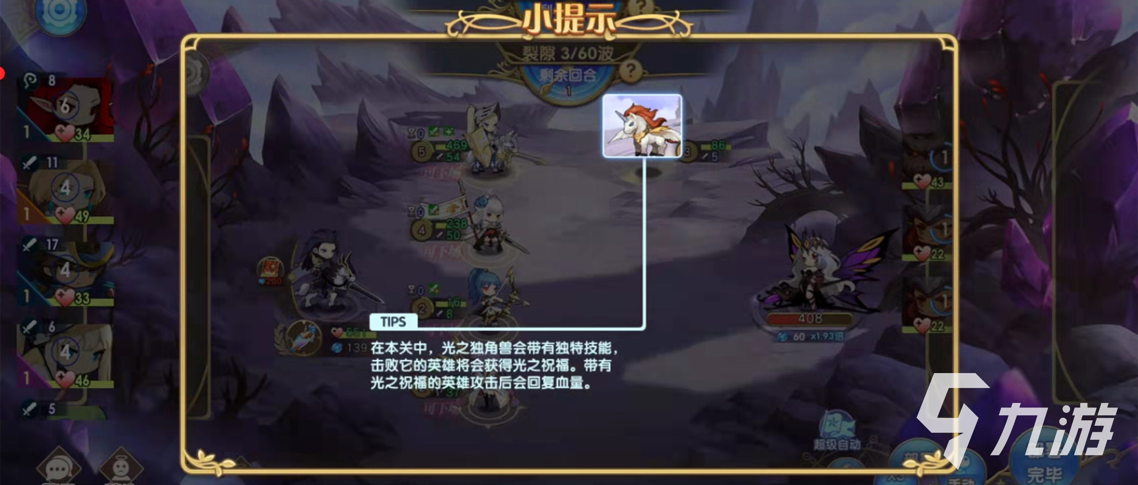 水晶山谷冒險模式有三個關(guān)卡,兩個普通關(guān)卡,一個首領(lǐng)關(guān)卡,玩家要一個關(guān)卡一個關(guān)卡的闖關(guān),首先花費5個挑戰(zhàn)幣進(jìn)入第一個普通關(guān)卡,系統(tǒng)提示在本關(guān)中,光之獨角獸會帶有獨特技能,擊敗他的英雄將會獲得光之祝福,帶有光之祝福的英雄攻擊后會回復(fù)血量的,所以幸運的玩家會得到光之獨角獸的憐愛。