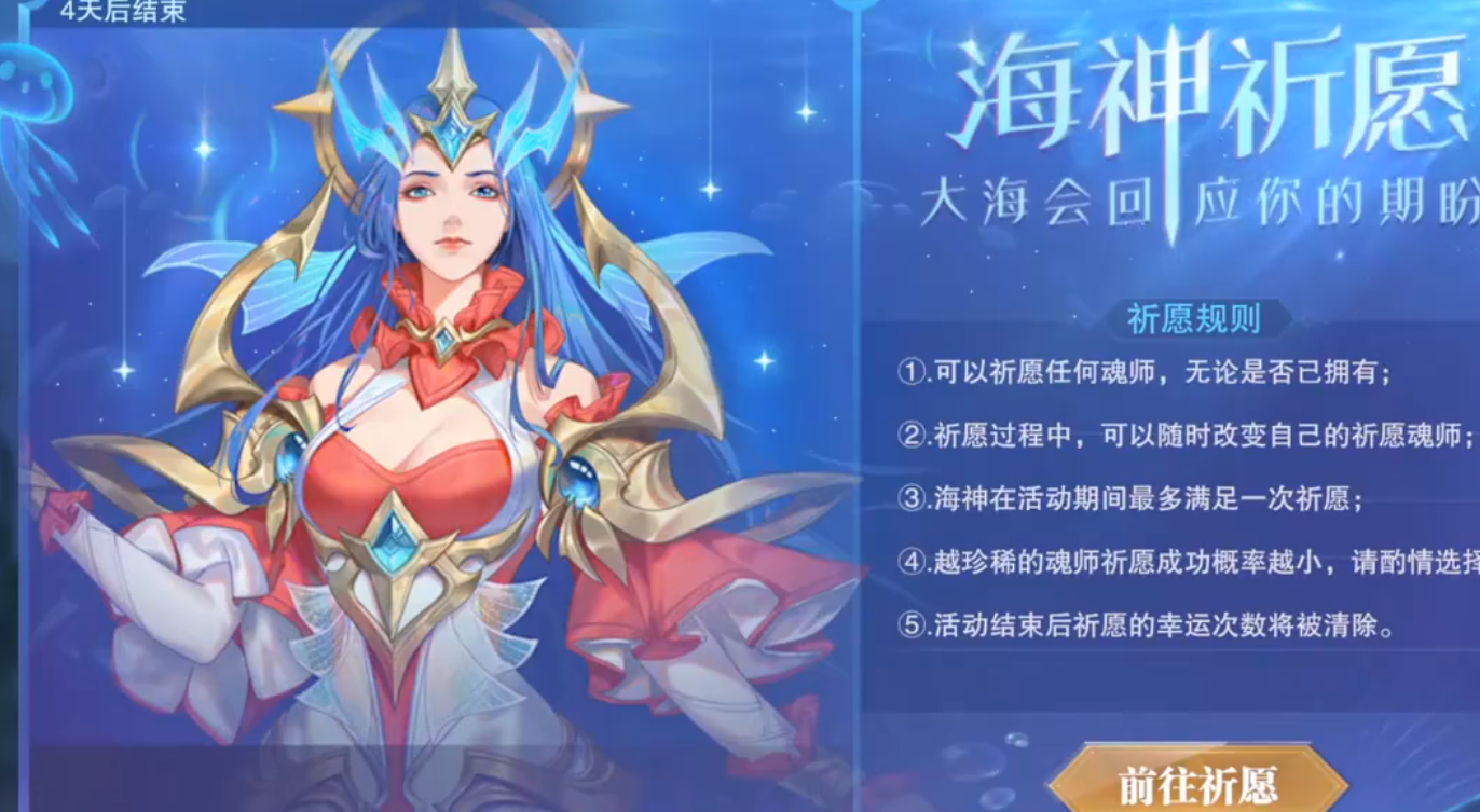 在這個(gè)活動(dòng)里面還包括海神祈愿這個(gè)項(xiàng)目, 這對(duì)于缺少某個(gè)魂師的玩家來(lái)說(shuō),是很好用的。你可以在這里面指定一個(gè)自己沒有的魂師,然后再進(jìn)行祈愿。 若是不缺魂師的話,就可以選擇一個(gè)神賜10萬(wàn)年魂環(huán),還是非常香的。