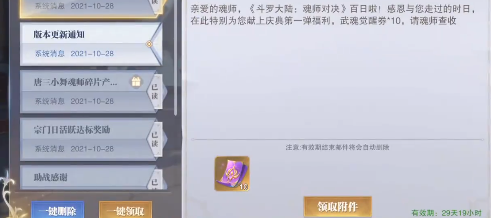那活動(dòng)推出之后,會(huì)進(jìn)行更新獎(jiǎng)勵(lì)的發(fā)送,贈(zèng)與你10張武魂覺醒券。另外在這個(gè)活動(dòng)期間,你完成日常積分任務(wù)的話,就可以累積積分去兌換,最終獎(jiǎng)勵(lì)是橙色的魂骨,還是特別誘人的。