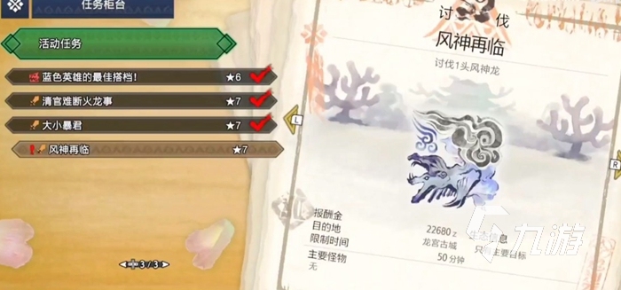 隨后我們前往集會(huì)所水蕓這里就可以接取活動(dòng)任務(wù)了,風(fēng)神再臨是緊接著大小暴君之后的一個(gè)活動(dòng)任務(wù),也是第三個(gè)七星級(jí)的集會(huì)所任務(wù)。需要大家的獵人等級(jí)達(dá)到HR8之后才可以接取,這次我們需要挑戰(zhàn)的就是風(fēng)神龍。
