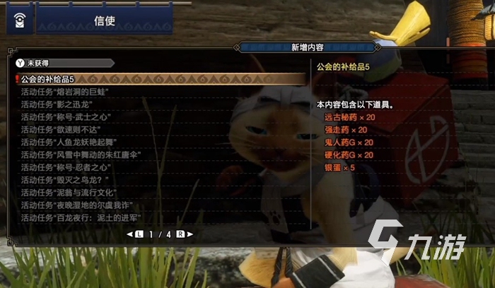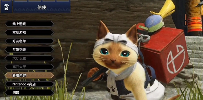 在村長站立位置的面前有一個站在箱子上的貓,這其實(shí)就是信使行千里了。在信使這里我們不僅可以進(jìn)行線上游戲,也可以查看、領(lǐng)取怪物獵人崛起的新增內(nèi)容。我們直接站在信使附近按A來與信使互動。打開互動菜單之后選擇靠下方的新增內(nèi)容,此時游戲會自動聯(lián)網(wǎng)檢索目前版本的新內(nèi)容。
