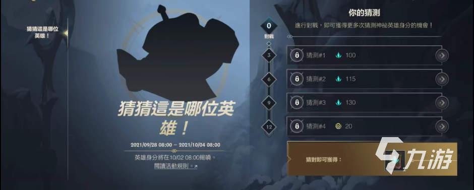 根據(jù)類似于上圖的剪影線索玩家需要猜測(cè)這是什么英雄,玩家總共有四次機(jī)會(huì),但是參見(jiàn)的門檻比較耗費(fèi)時(shí)間,玩家需要完成游戲?qū)止彩?,但是玩家每解鎖一個(gè)猜測(cè)池,獎(jiǎng)勵(lì)也是會(huì)如約而至的。