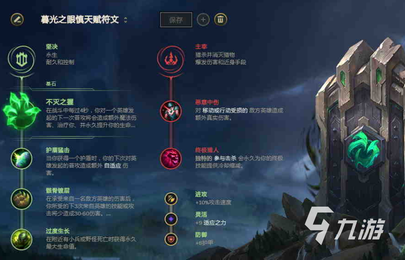 主系堅決里面點不滅之握、護盾猛擊、骸骨鍍層以及過度生長;副系主宰里面點惡意重傷和終極獵手。