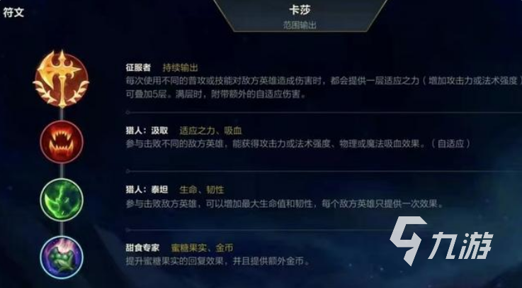 符文首選征服者,和卡莎的性能非常適配,整體增加了卡莎的傷害能力以及機(jī)動(dòng)性。副系選擇獵人”汲取“、獵人”泰坦“、甜食專家,不僅保障了卡莎能平穩(wěn)度過對(duì)線期,又能讓英雄在后期也有優(yōu)秀的戰(zhàn)斗能力。