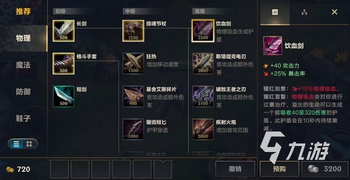 飲血?jiǎng)Γ猴嬔獎(jiǎng)槲覀兲峁┝?0點(diǎn)的攻擊力以及25%的暴擊率加成,另外也是最出名的吸血裝備之一。飲血?jiǎng)Φ谋粍?dòng)技能猩紅劍意可以為我們提供15%的物理吸血效果,并且吸血之后還會有一個(gè)過量治療護(hù)盾。