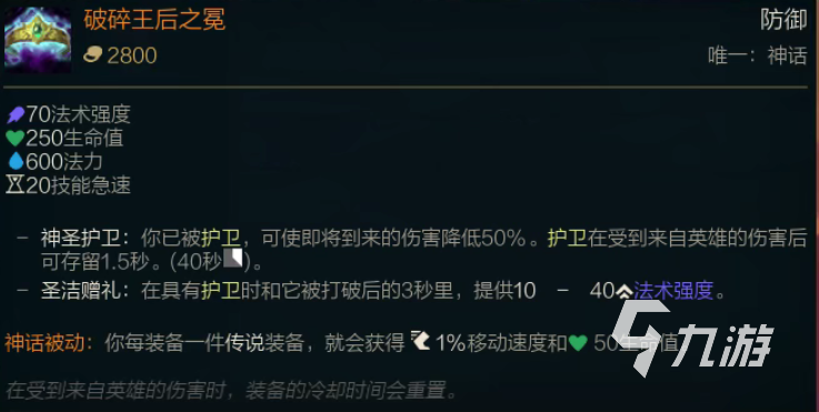 破碎王后之冕可以提供70的法球強度,250的生命值加成以及600的法力值和20的技能極速效果,可以看出這事一件法師裝備,這件裝備由于提供了一定的生命值加成,對于法師的生存能力也得到了很大的提升,這件裝備最厲害的就是它的被動效果了,可以讓在被護衛(wèi)保護的時候受到的傷害降低50%,這對于保命是非常好用的。