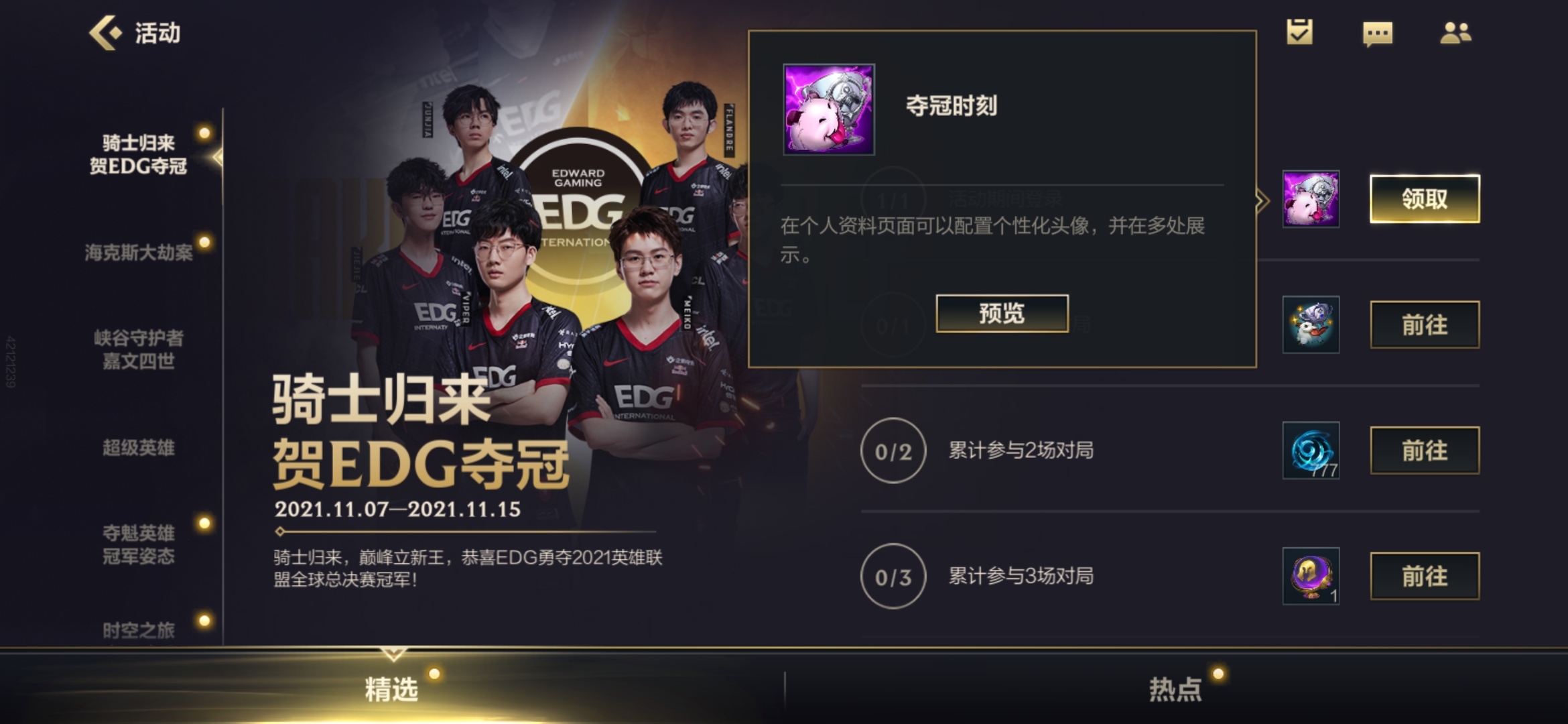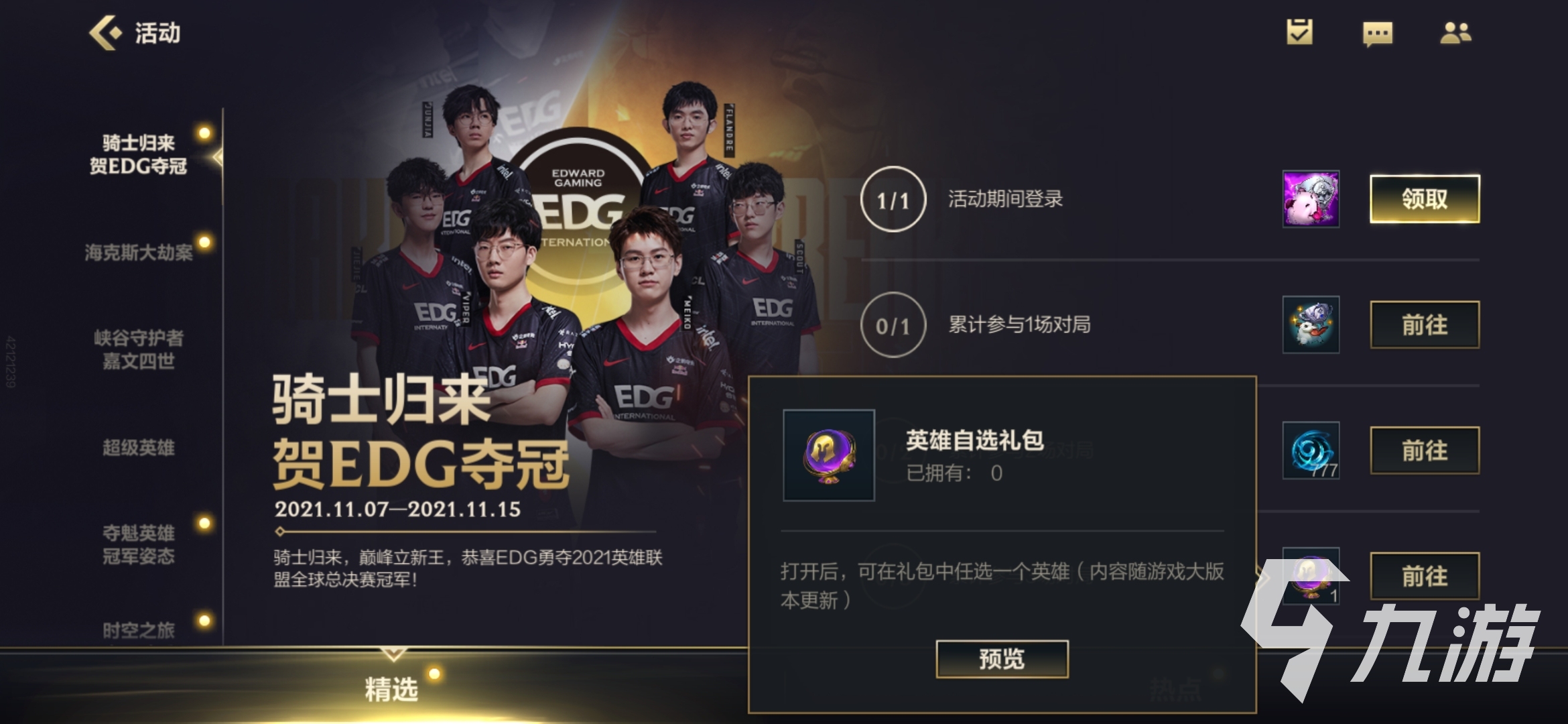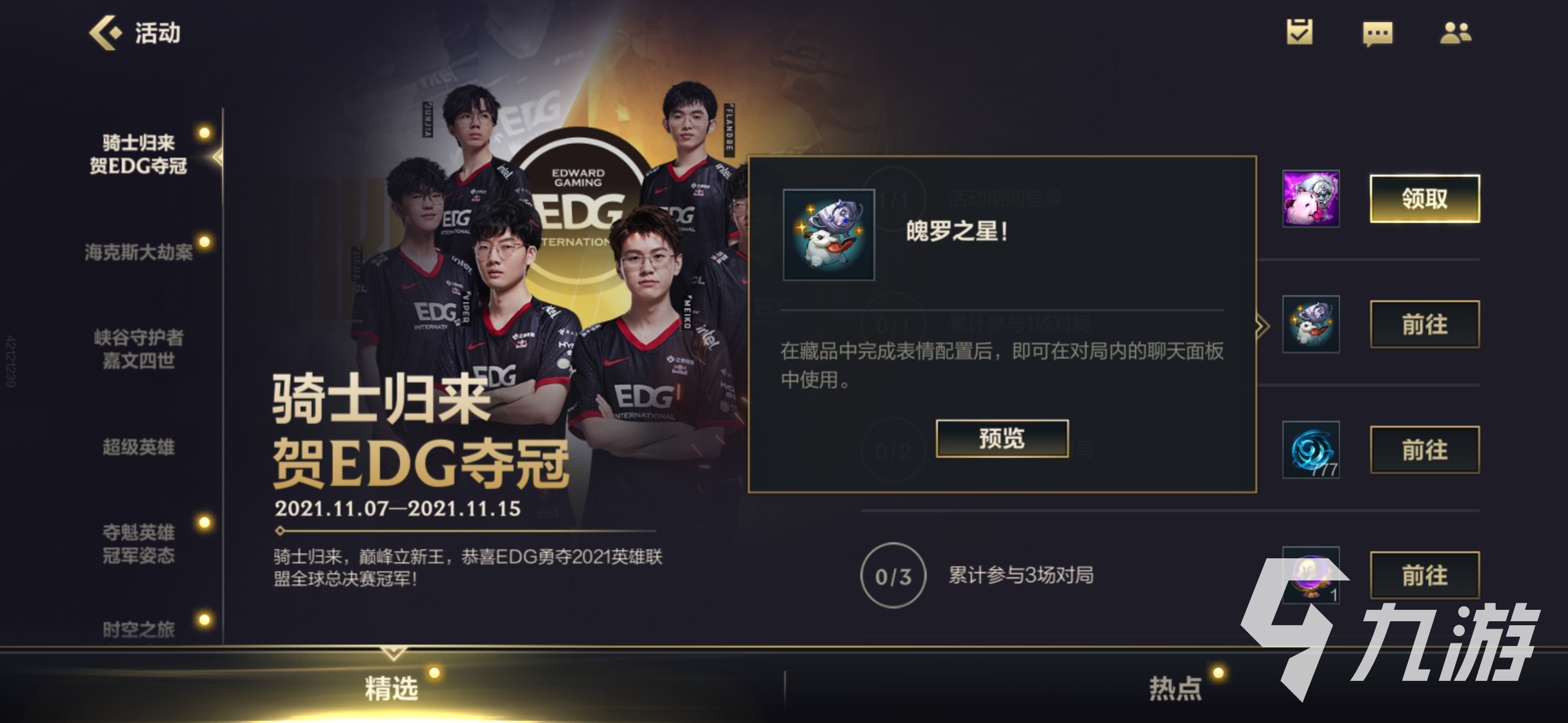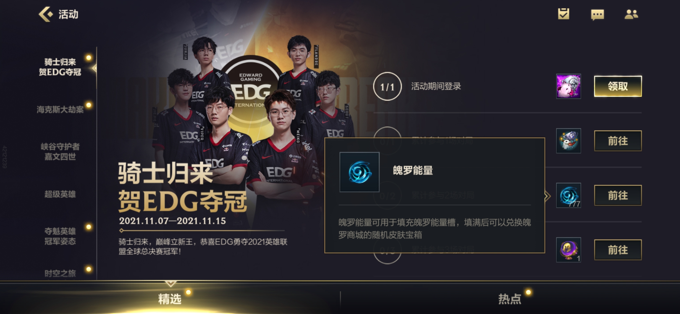來(lái)源: 極光 作者: 等天黑 2021年11月13日 17:50EDG戰(zhàn)隊(duì)奪冠了,小伙伴都非常高興,那么今天小編就來(lái)帶來(lái)英雄聯(lián)盟手游騎士歸來(lái)活動(dòng)怎么玩的介紹,這里小編會(huì)為小伙伴帶來(lái)這個(gè)活動(dòng)的詳細(xì)時(shí)間以及小伙伴需要完成的任務(wù),同時(shí)當(dāng)然少不了這次活動(dòng)的獎(jiǎng)勵(lì)介紹了。