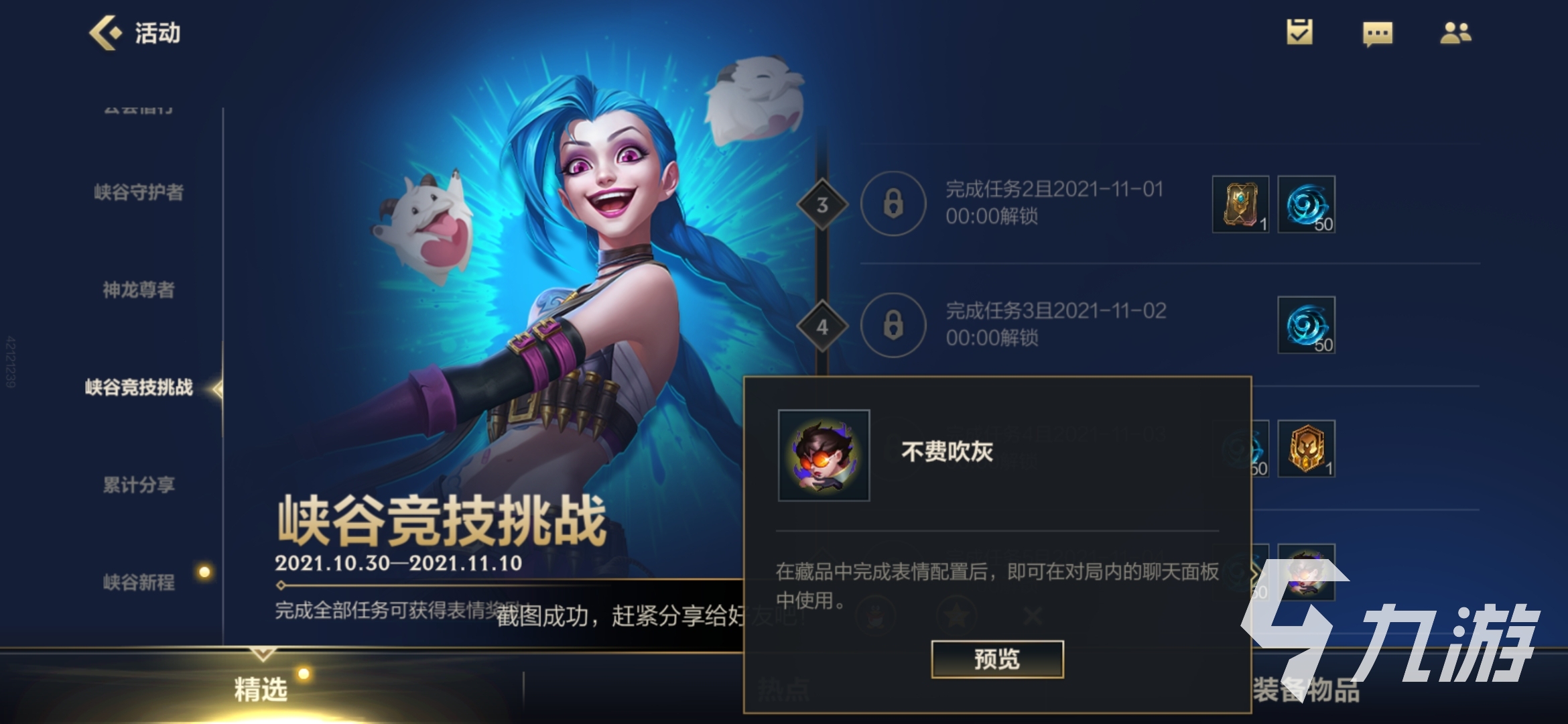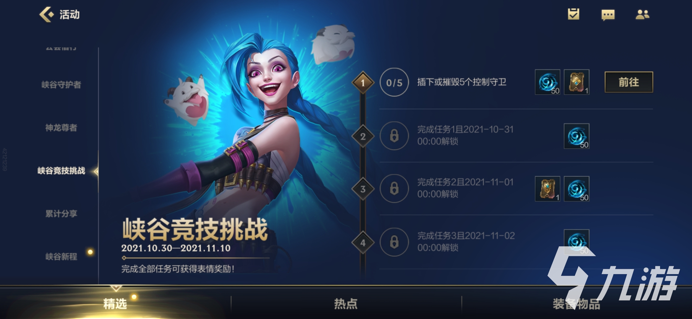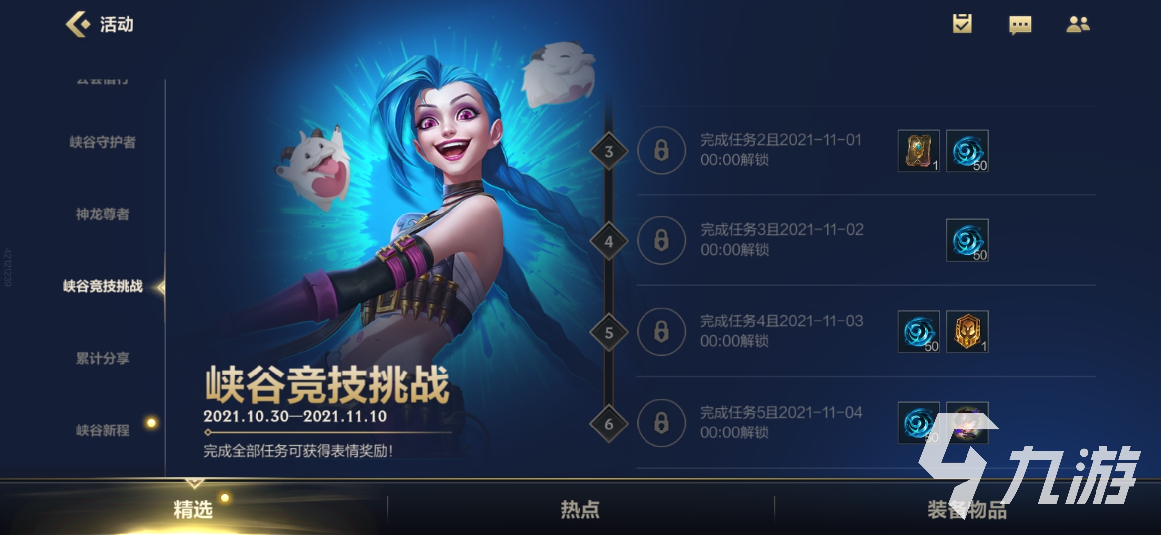 這次的峽谷競(jìng)技挑戰(zhàn)活動(dòng)是從10月30號(hào)一直到11月10號(hào)的,持續(xù)的時(shí)間還是非常長(zhǎng)的,一共是有著六個(gè)任務(wù)需要小伙伴來完成的,所以這個(gè)時(shí)間方面還是非常充裕的,小伙伴不需要擔(dān)心時(shí)間的問題,是一定夠用的,小伙伴一步一步來,獲取最后的獎(jiǎng)勵(lì)是非常輕松的。