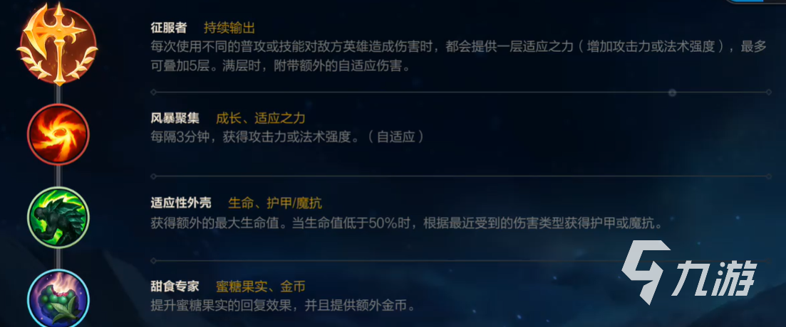 在三進(jìn)化卡莎的天賦方面主要還是選擇征服者。征服者可以為卡莎提供高額的自適應(yīng)加成。第二難選擇風(fēng)暴聚集。風(fēng)暴聚集可以讓卡莎更快的升級技能。第三欄,選擇適應(yīng)性外殼。提升卡莎的生存能力。第四欄選擇目前通用比較強勢的甜食專家。