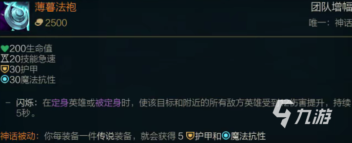 薄暮法袍這是一件全新的裝備,屬性為神話,神話帶來的效果是雙抗加成,意味著這是一件坦克裝備,薄暮法袍可以為英雄提供200血量,20技能急速,30的雙抗效果,重點(diǎn)是這件裝備的特效就是在定身對方英雄之后,能夠讓這個被定身的敵人收到隊友的額外傷害。