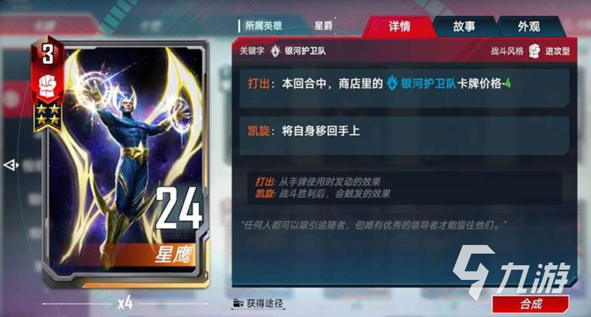 速升到4本,期間找到星鷹時(shí)立即打出,可以節(jié)省不少經(jīng)濟(jì),尤其是當(dāng)前國(guó)服經(jīng)濟(jì)卡稀少。當(dāng)場(chǎng)上已有4星德拉克斯和4星星鷹時(shí)就是升5時(shí)機(jī),找星爵,同時(shí)可以通過(guò)正義感召找齊剩下的銀護(hù)關(guān)鍵牌。