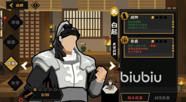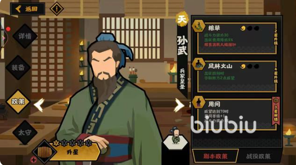 公元前402年,在姑蘇城出現(xiàn),我們需要正確的進行對話才能獲取到他??偟膩碚f他是一個很強的軍事名臣,政策方面可以增加我們的戰(zhàn)斗力(但會增加糧食消耗),出征獲勝時可以增加我們的威望。