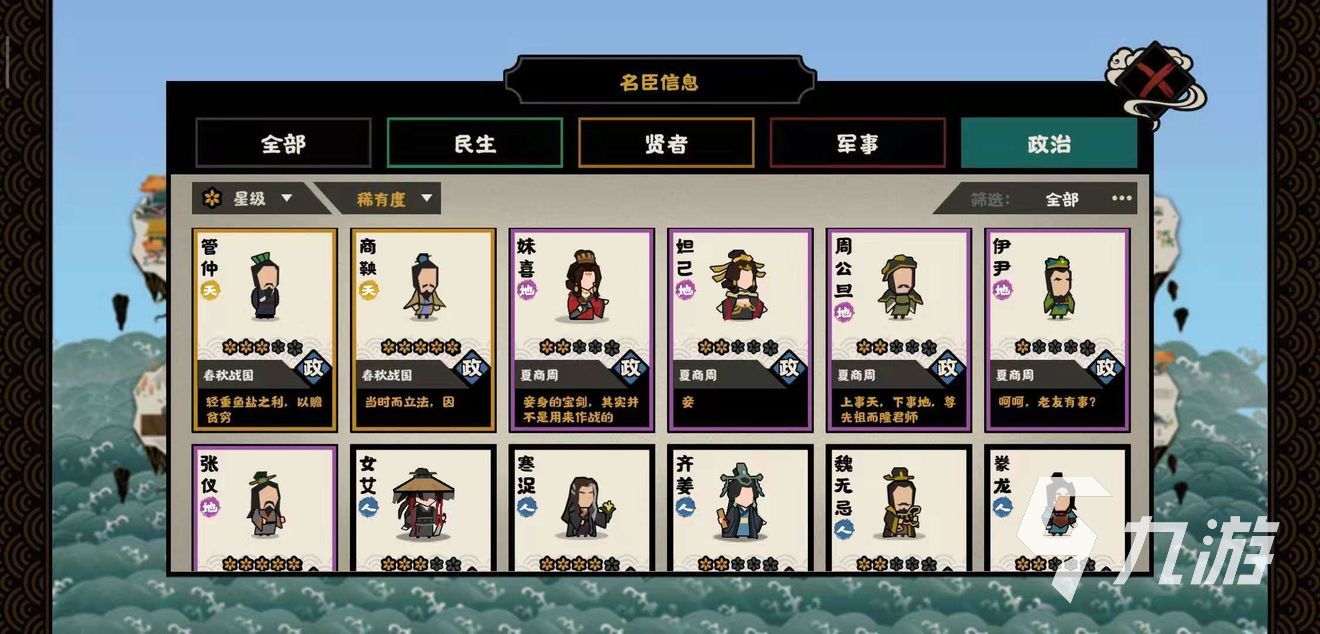 T0:商鞅(天),管仲(天)。我們十分熟悉的商鞅和管仲,在無悔華夏里是天級卡,天級卡很難抽,我們來簡單介紹他們,重點還是放在地級和人級卡的推薦。商鞅外號“反貪局局長”,對腐敗的控制是一流的,且在腐敗不足時有大幅提升,需要搭配腐敗有關(guān)的名臣使用。管仲擅長搞錢,金錢提升是蹭蹭蹭的上升。