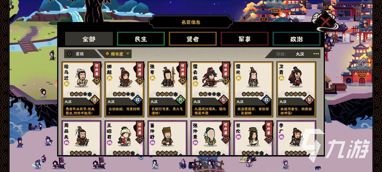 這里推薦幾個角色玩家可以嘗試培養(yǎng),其中一個就是桑弘羊,他得第一個能力名叫鹽鐵官營,作用是在軍隊的數(shù)量到達十萬的時候,金錢的產(chǎn)量就會提升百分之六十,鐵的產(chǎn)量也會提升。