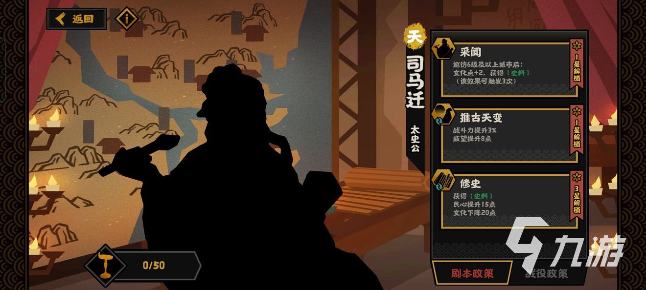 還有一位人物叫司馬遷,他的第一個能力名叫采聞,是巡防到六級以上的城市只有,就會增加兩個點數(shù)的文化值,并獲得史料,這個技能效果可以觸發(fā)三次。