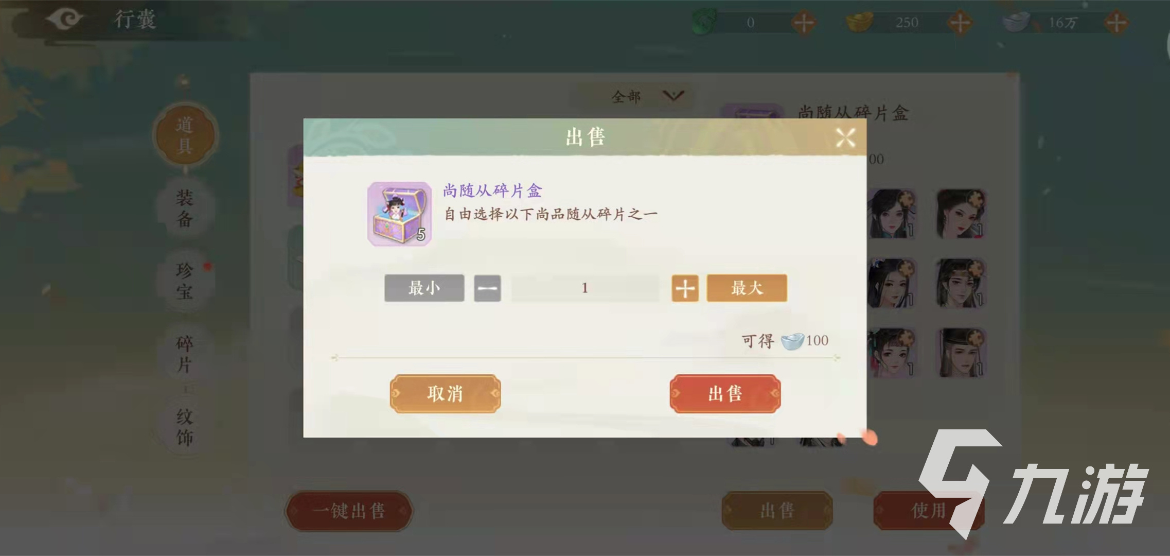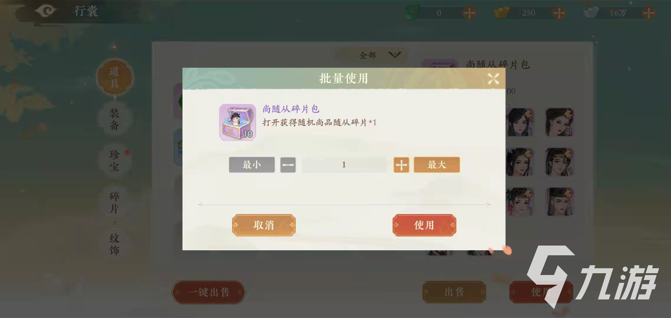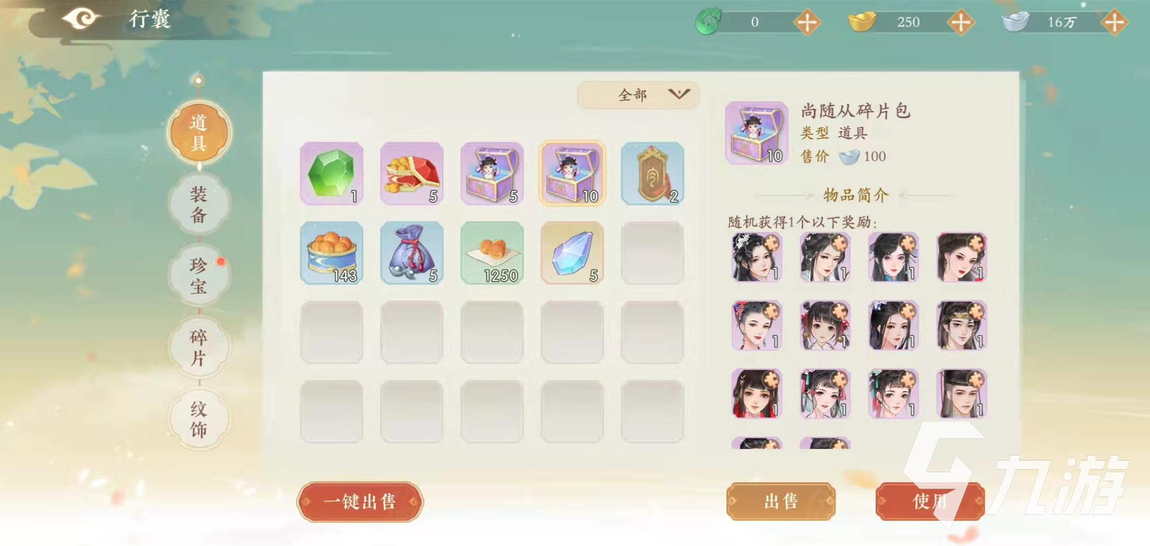 玩家點(diǎn)擊尚隨從碎片包,右面會(huì)出現(xiàn)一個(gè)小界面來顯示,介紹玩家擁有尚隨從碎片包的個(gè)數(shù),同時(shí)顯示類型是道具,售價(jià)一百銀元寶,從尚隨從碎片包中掉落的碎片種類一共有十六種,其中女子碎片還是比較居多的,玩家可以有兩種方式使用道具,第一種是出售,第二種就是使用。