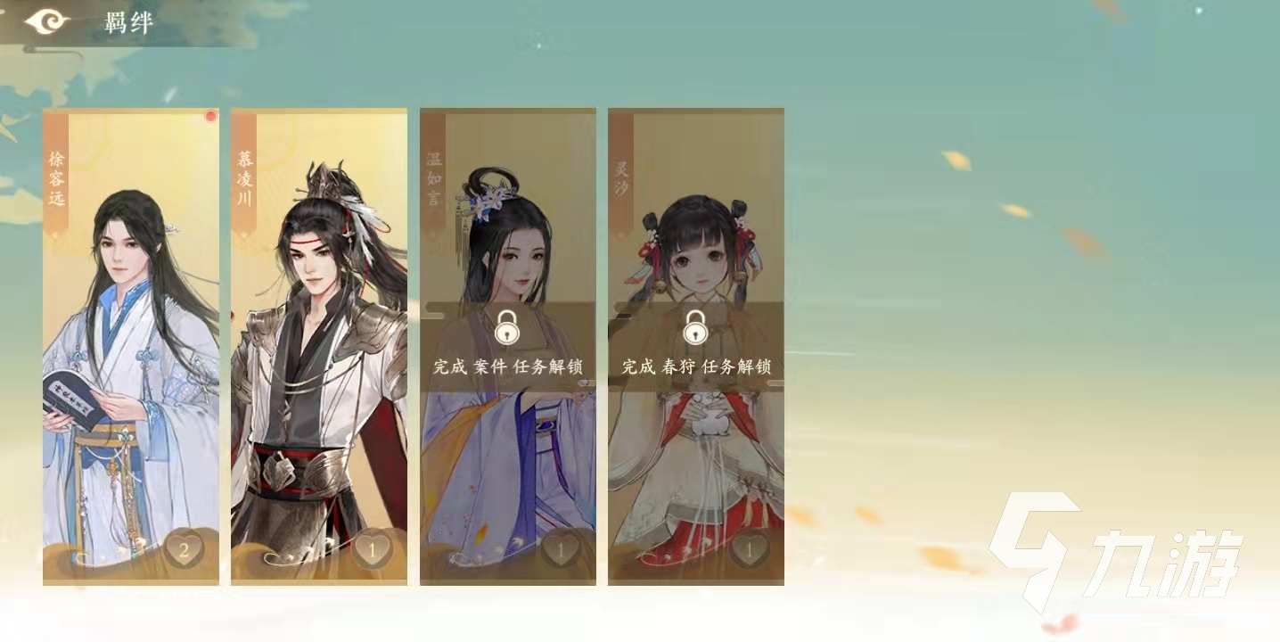 羈絆屬于游戲內(nèi)的副本劇情,當(dāng)玩家通關(guān)主線劇情第二章的所有內(nèi)容之后,可以在菜單欄解鎖羈絆,進入羈絆板塊之后,玩家可以看到四個羈絆人物,分別是徐思遠、慕凌川、溫如言以及靈汐,這四個人物都是與主角關(guān)系匪淺的,徐思遠以及慕凌川都是官場熟人,完成官場任務(wù)自動解鎖,溫如言需要完成案件任務(wù)解鎖,靈汐則是完成春狩任務(wù)解鎖。