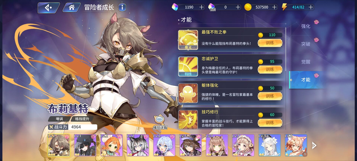 前排英雄的話,小編建議大家選擇布莉基特。布莉基特也被大家昵稱為斗牛犬,這是因?yàn)樗膴W義技能和特技技能都有嘲諷效果。布莉基特的奧義技能是一個范圍嘲諷,隨機(jī)選擇3個敵方單位,有60%的幾率嘲諷他們。而她的特技技能是一個單體嘲諷有60%的幾率嘲諷敵人,并且獲得25%的格擋加成。