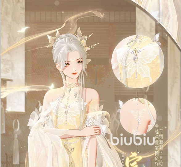 發(fā)型方面,選擇的是蝶影留香,這個發(fā)飾小編個人也是非常喜歡的,輕紗材料制作的蝴蝶形狀搭配上金色的盤發(fā),整體看起來端莊大方,宛如絕塵而來的仙子,更是一幅古典優(yōu)美的畫卷。