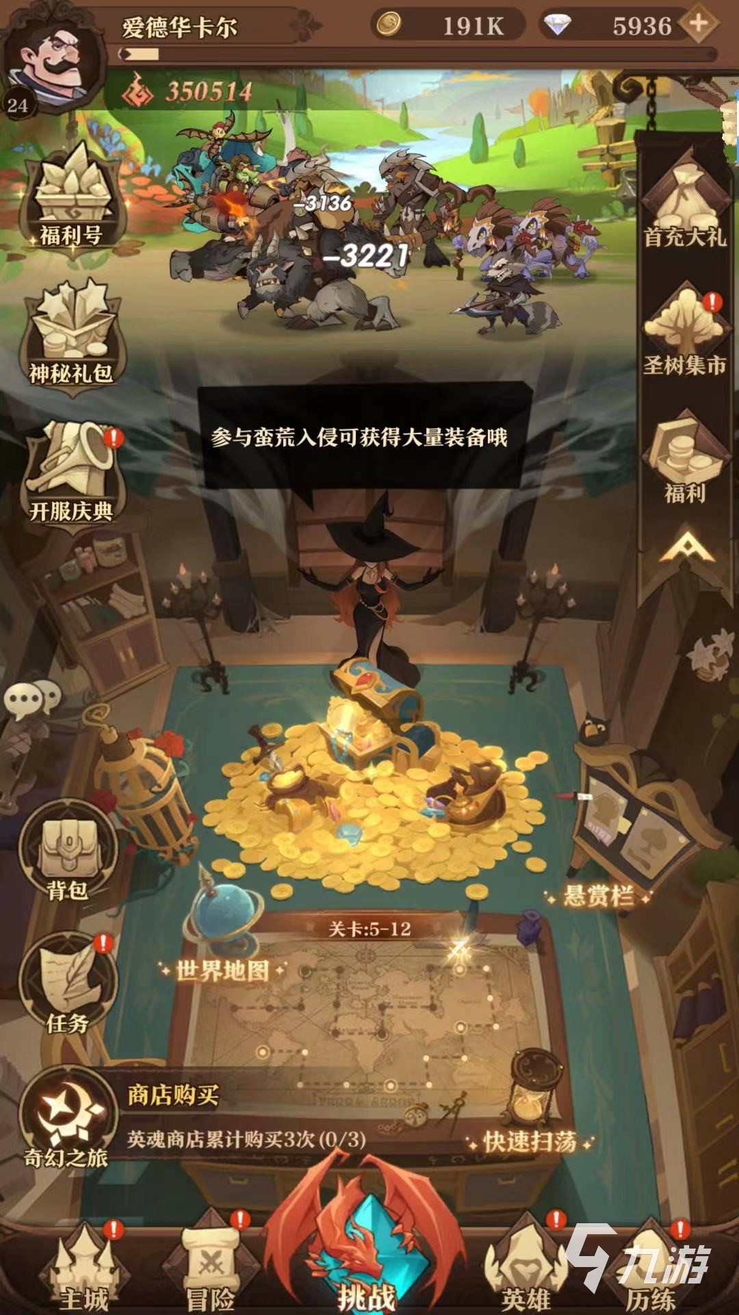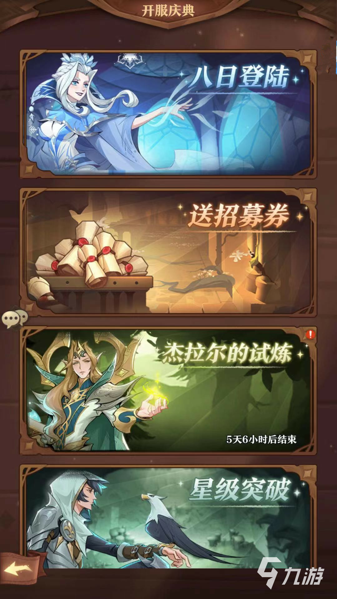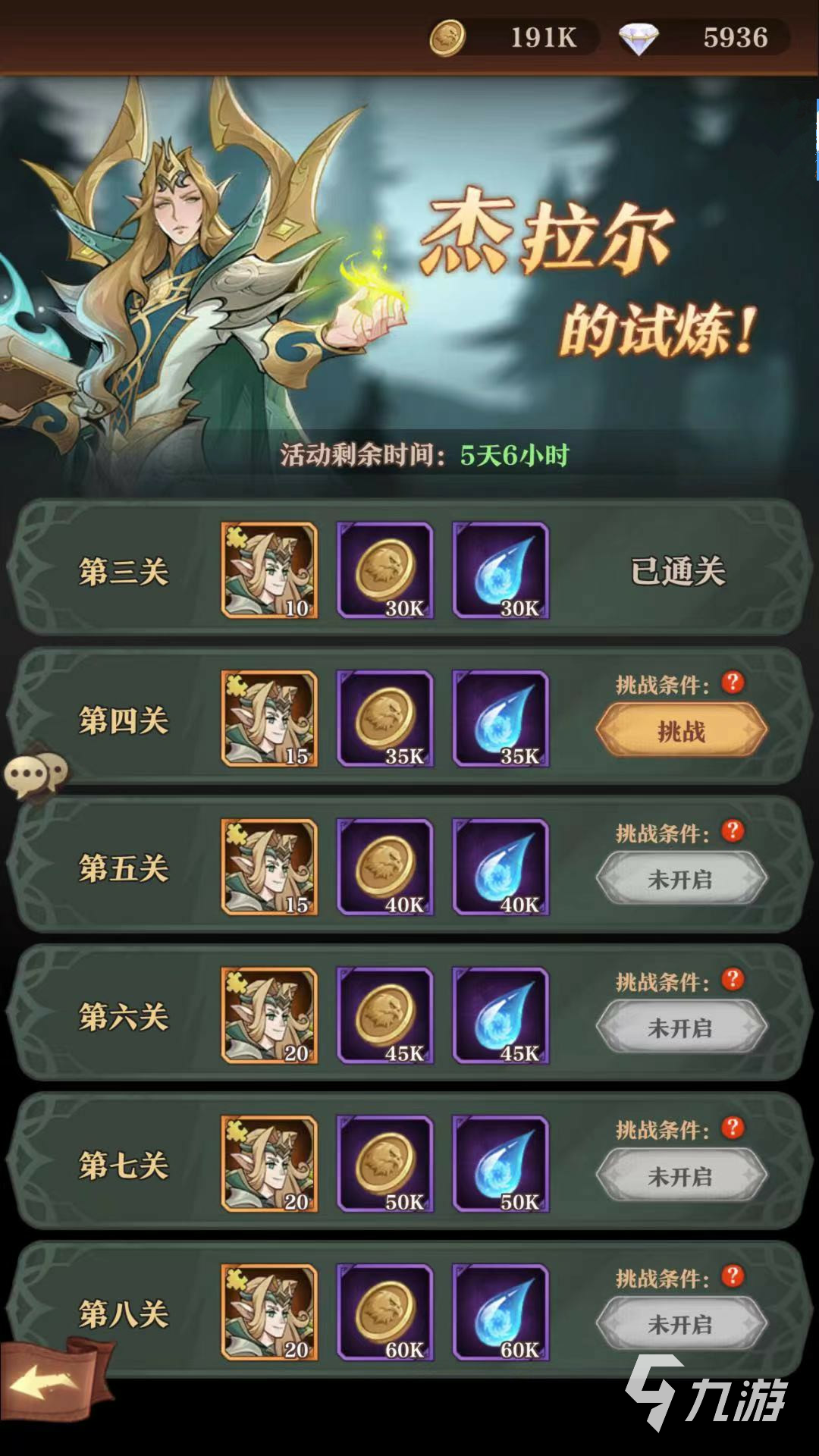 玩家進(jìn)入游戲后,可以在主頁面中看到包括主城,冒險,戰(zhàn)役,英雄等相應(yīng)頁面,在戰(zhàn)役中可以看到包括開服慶典,圣樹集市等不同活動地點(diǎn),選擇開服慶典進(jìn)入其中,包括杰拉爾的試煉活動,通過參與挑戰(zhàn)可以獲得杰拉爾碎片和其他相關(guān)道具獎勵,當(dāng)滿足挑戰(zhàn)條件后,即可進(jìn)入挑戰(zhàn)模式,選擇上陣的英雄進(jìn)行挑戰(zhàn),當(dāng)挑戰(zhàn)成功后,可以順利獲得杰拉爾碎片和經(jīng)驗(yàn)值。