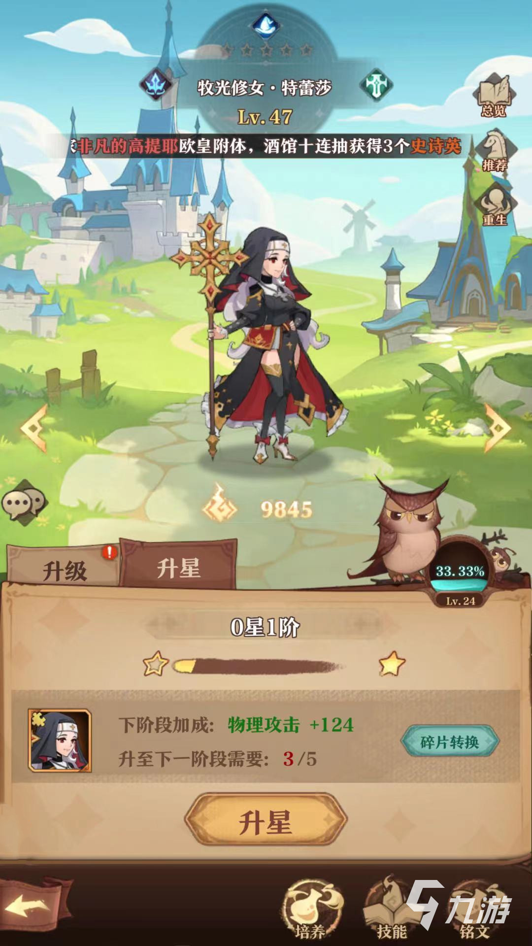 玩家進(jìn)入游戲后,可以在英雄頁(yè)面中查詢到英雄的相關(guān)信息,選擇指定的英雄進(jìn)入英雄詳細(xì)頁(yè)面,看到包括升級(jí)和升星功能。