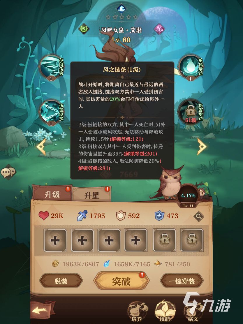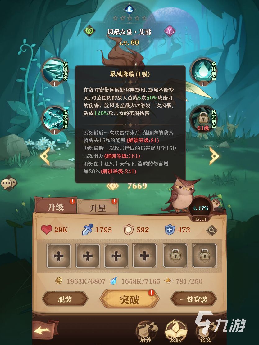 升級(jí)到61級(jí)之后的艾琳,她在釋放技能的時(shí)候,可以改變戰(zhàn)斗節(jié)奏,具體表現(xiàn)為可以改變戰(zhàn)斗的天氣,釋放狂風(fēng)大作之后可以直接降低敵方所有人的技能普攻命中以及攻擊速度,還會(huì)在狂風(fēng)天氣下額外受到艾琳20%的傷害,這就說(shuō)明她的范圍傷害可以說(shuō)是高到不能再高了,可以說(shuō)艾琳是自然回響陣營(yíng)最強(qiáng)的輸出,需要配合前排以及聚怪的英雄才可以發(fā)揮她的力量。