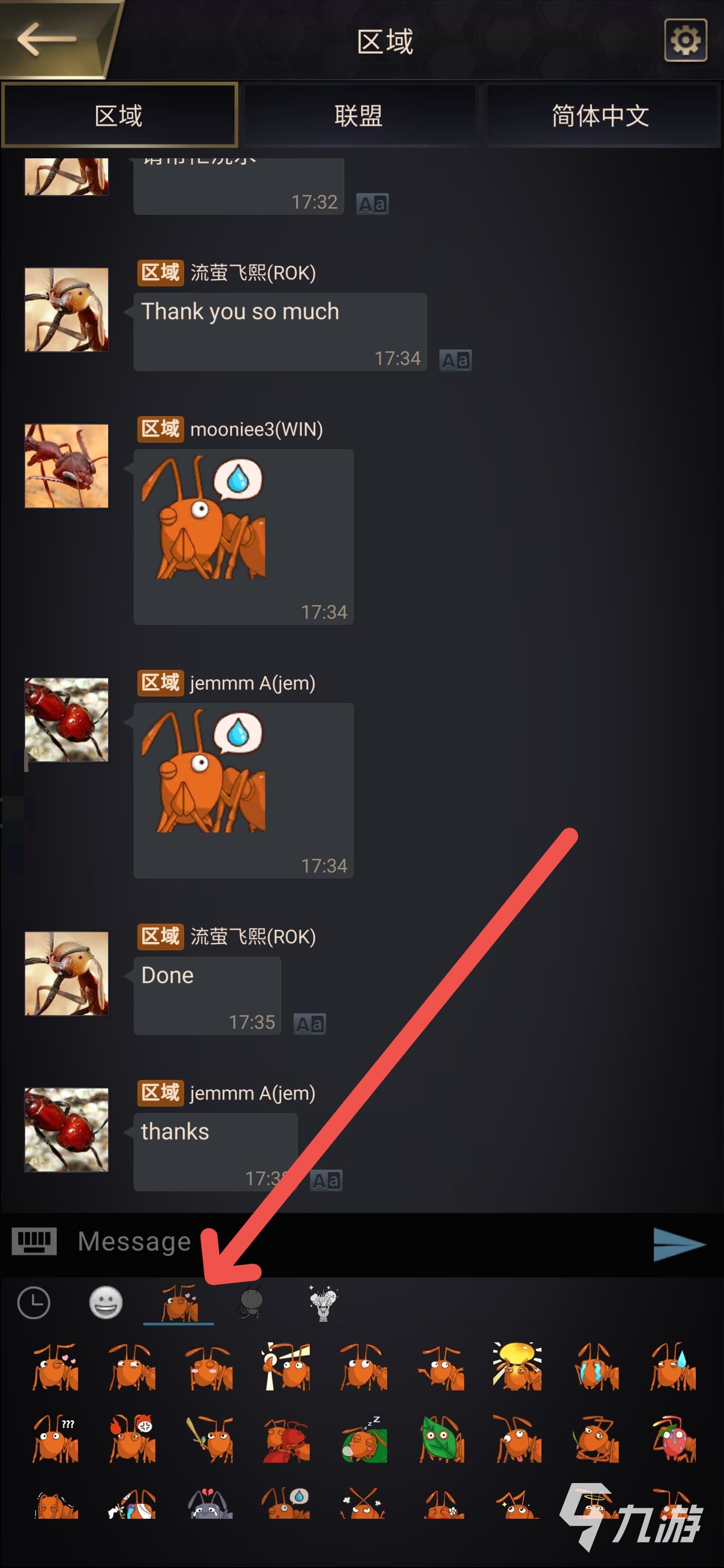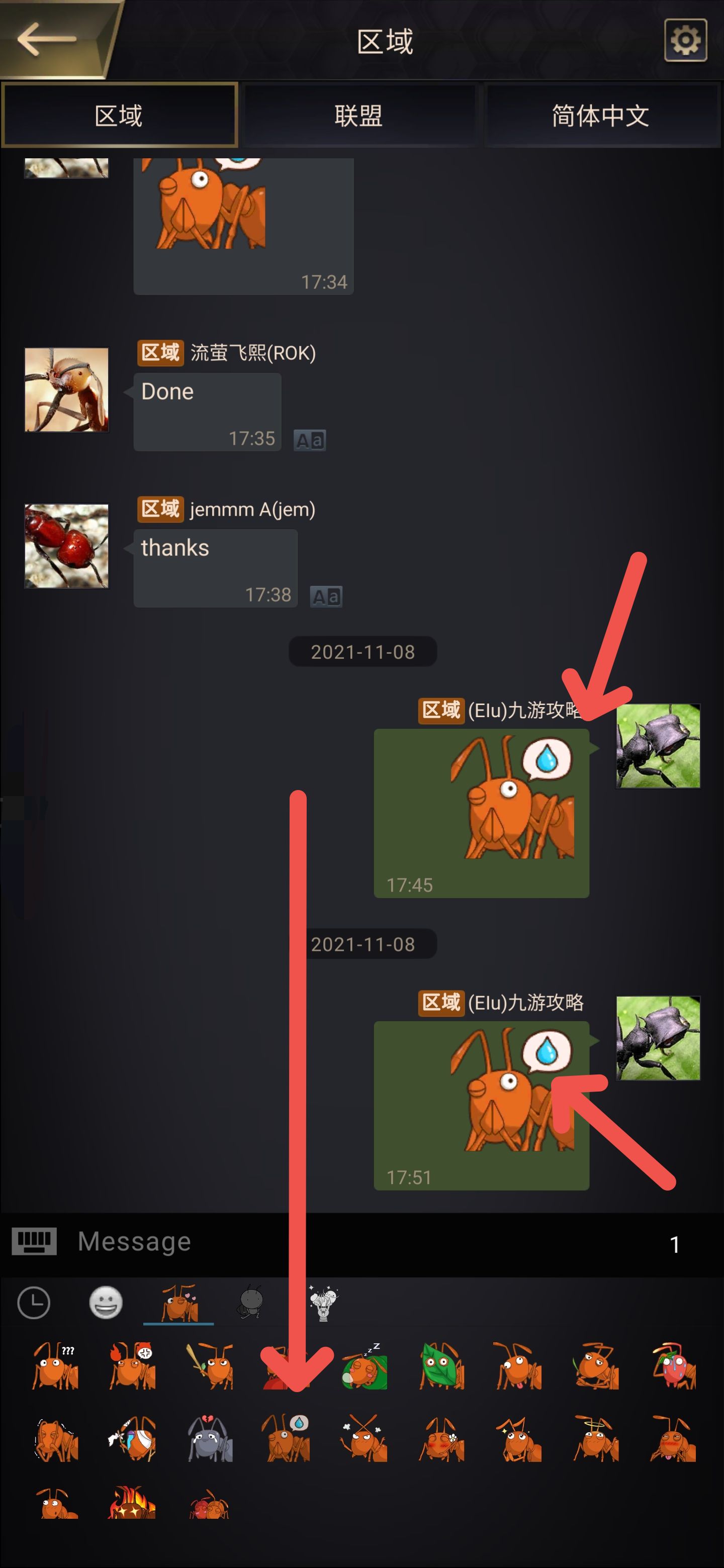 各位玩家都可以在世界頻道求區(qū)域內(nèi)的其他玩家,幫助自己澆水,所以發(fā)求水的主要操作步驟為點擊屏幕下方的聊天窗口,接下來和區(qū)域內(nèi)的也好,聯(lián)盟內(nèi)的也好,打開表情界面,找到一只螞蟻頭頂上有一個水滴的表情,并且螞蟻還坐著雙手Please的姿勢,這個的意思就是求水,雖然說游戲中有自動AI翻譯系統(tǒng),但玩家們還是發(fā)求水的表情比較直接。