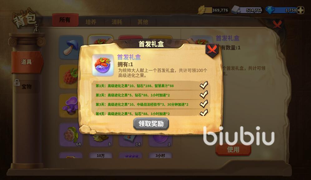 在得到首發(fā)禮盒的第一天,大家的選擇主要有高級進化之果、鉆石以及智慧果汁。鉆石可以直接忽略掉,這個道具可以在主線劇情任務當中大量的獲取,智慧果汁雖然可以快速提升英雄等級,但同樣可以在副本當中得到。所以第一天建議大家直接選擇高級進化之果,利用該道具去召喚英雄。