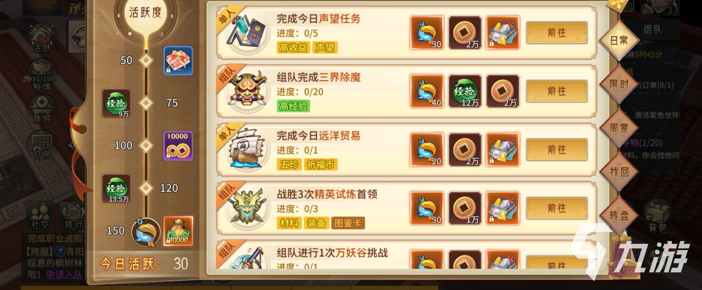玩家只要去神殿里面找落菡領(lǐng)取聲望任務(wù),聲望任務(wù)一般都是去村莊、小鎮(zhèn),例如:宛村、日輪坊等,解決當(dāng)?shù)氐难肭謫栴},像去宛村就是為了幫助村長打敗10只雙生妖精,難度都不怎么高,只要玩家完成了5次聲望任務(wù)即可領(lǐng)取30點(diǎn)活躍度。