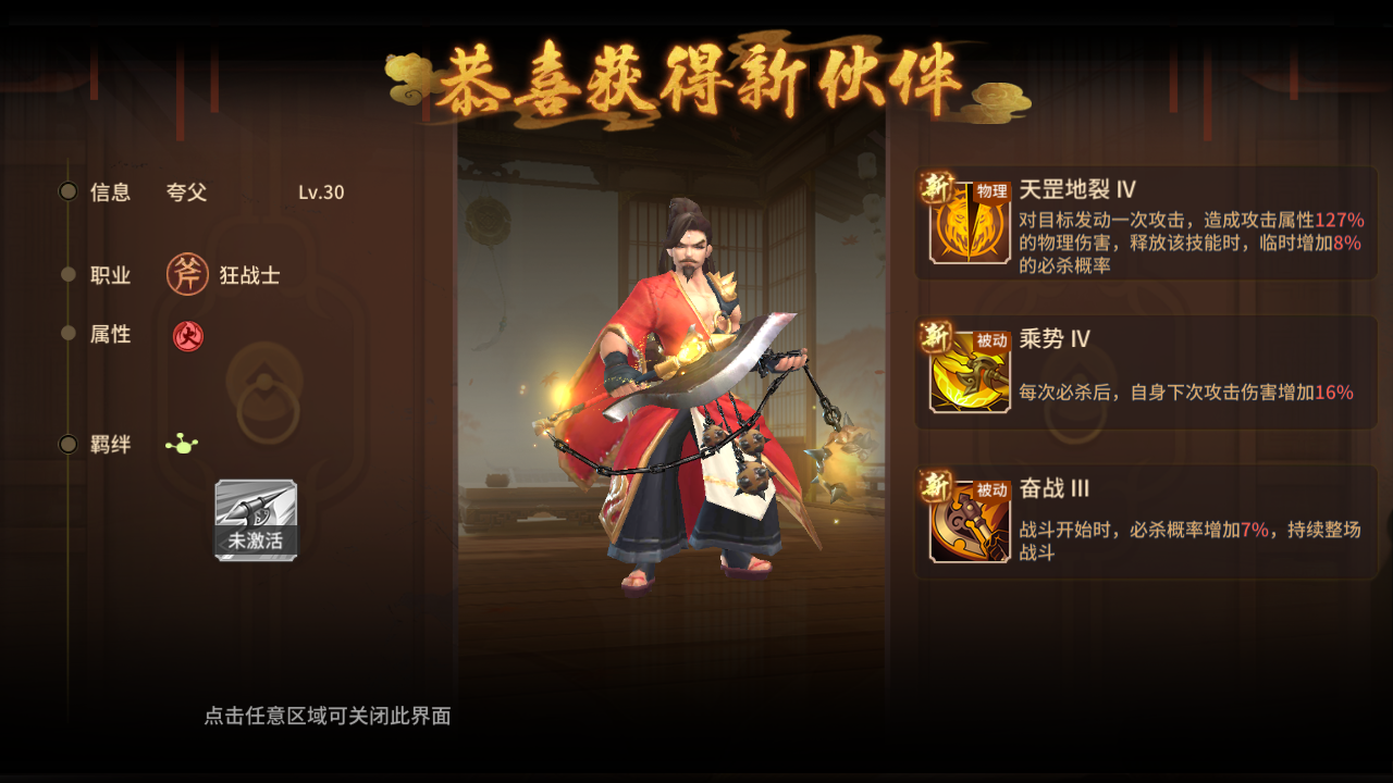 羈絆技能“碎涅”可以為主角帶來攻擊和生命值的提升,狂戰(zhàn)士的核心能力就是這兩個,主角是物理系的話還是可以獲得不錯加成的。技能上來看,夸父的實戰(zhàn)能力很強,單體爆發(fā)高,可以在挑戰(zhàn)和競技中選擇使用培養(yǎng)的。