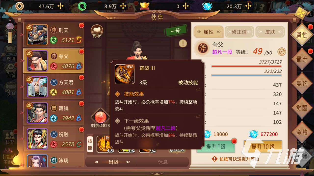 被動技能“奮戰(zhàn)”,該技能在戰(zhàn)斗開始的時候就可以獲得7%的必殺率提升,這個效果是持續(xù)整場戰(zhàn)斗的,也不會被驅散技能影響。技能等級越高,必殺率的提升也就越大。在有了這個被動之后,實戰(zhàn)中的必殺率就有不錯的效果了,杜宇夸父的提升是很大的。