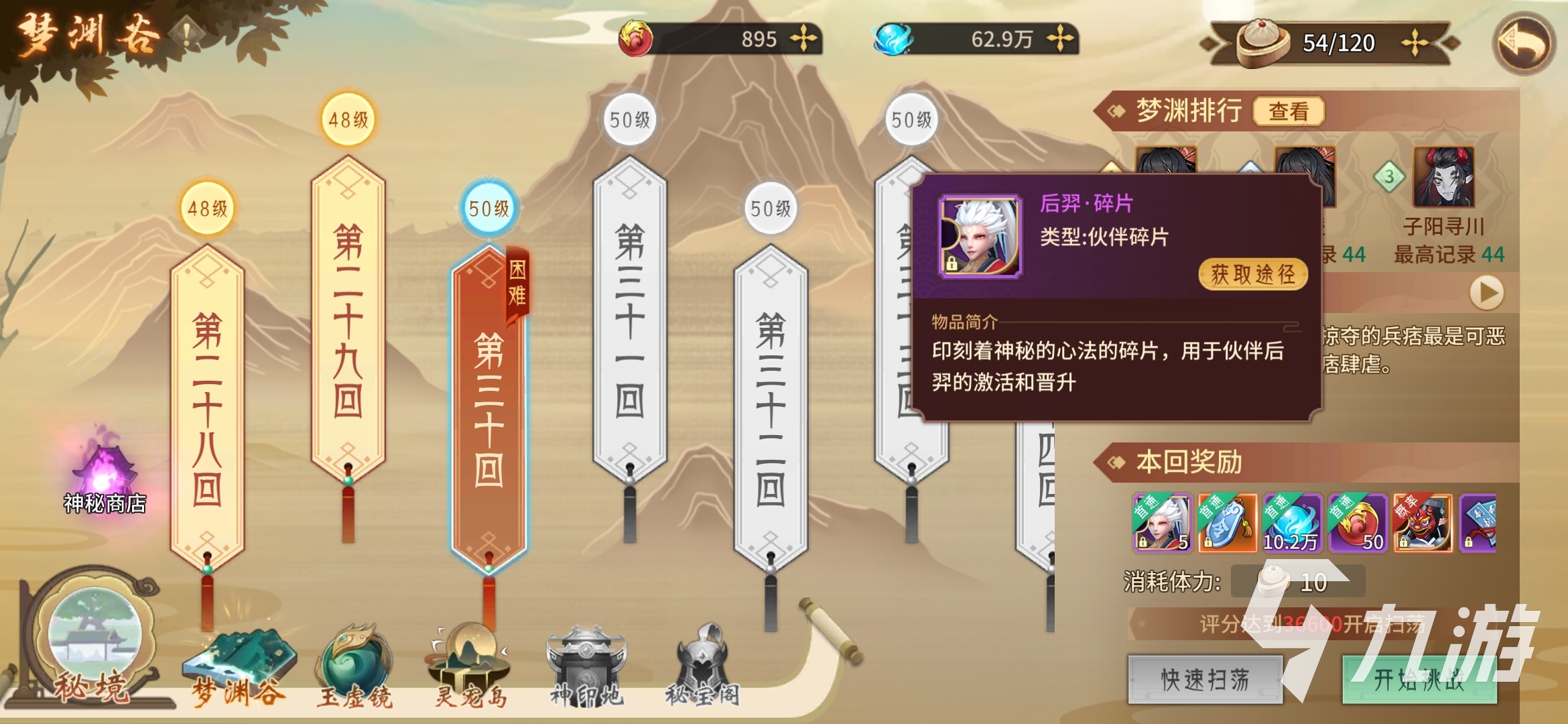 秘境的夢(mèng)淵谷是最快獲得伙伴碎片的副本之一,這里有不同的小回合本,每個(gè)回合本第一次挑戰(zhàn)成功后即可獲得通關(guān)伙伴碎片,不同的回合可獲得碎片也不一樣,有后羿、祝融、凰、姜子牙等等。