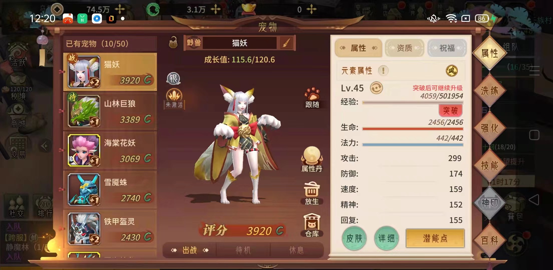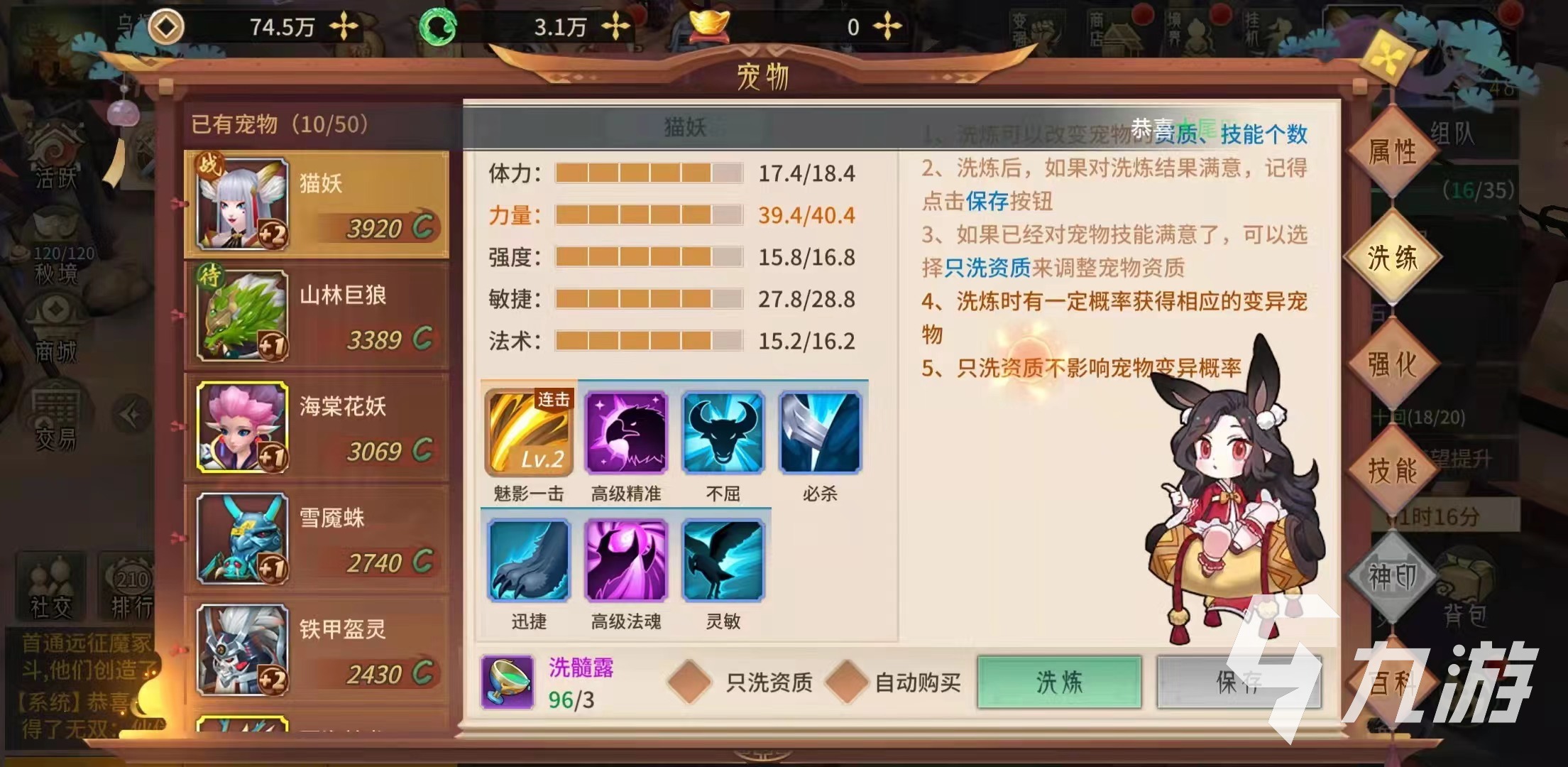 游戲里還有洗練的功能,可以通過洗髓露來進行洗練,洗練可以改變貓妖的資質以及技能個數(shù),如果已經(jīng)對貓妖技能滿意了,也可以選擇只洗資質來調(diào)整寵物資質,洗練過程中有一定概率獲得相應的變異寵物,只洗資質不影響寵物的變異概率。