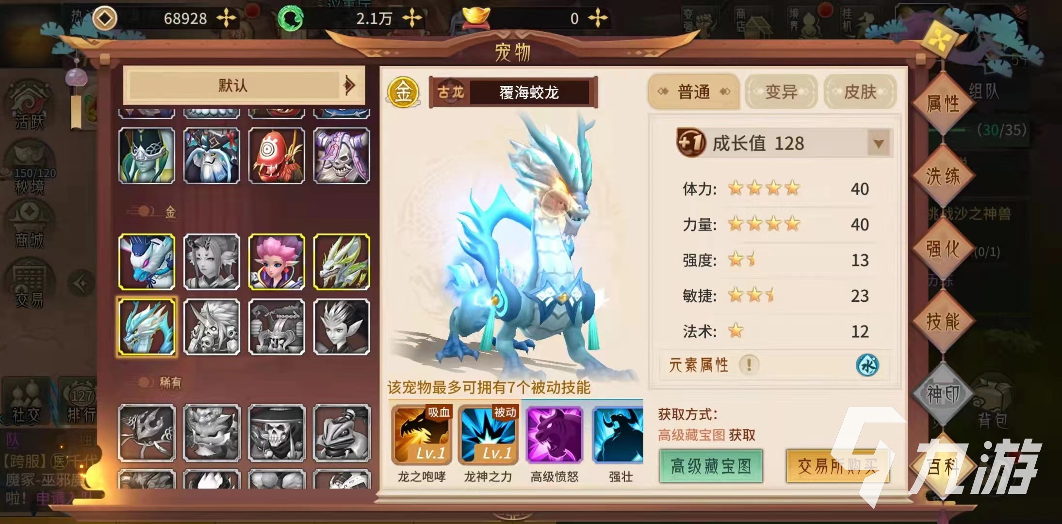 覆海蛟龍:兩個專屬技能,一個是龍之咆哮,對一個目標發(fā)動4次物理攻擊,每次造成攻擊屬性29%的物理傷害,如果成功擊殺目標,回復(fù)等同于2倍攻擊屬性的生命。另一個是龍神之力,龍之咆哮有40%的概率觸發(fā)深度一擊,直接一次性造成195%的物理傷害,如果成功擊殺目標,依然回復(fù)同于2倍攻擊屬性的生命。