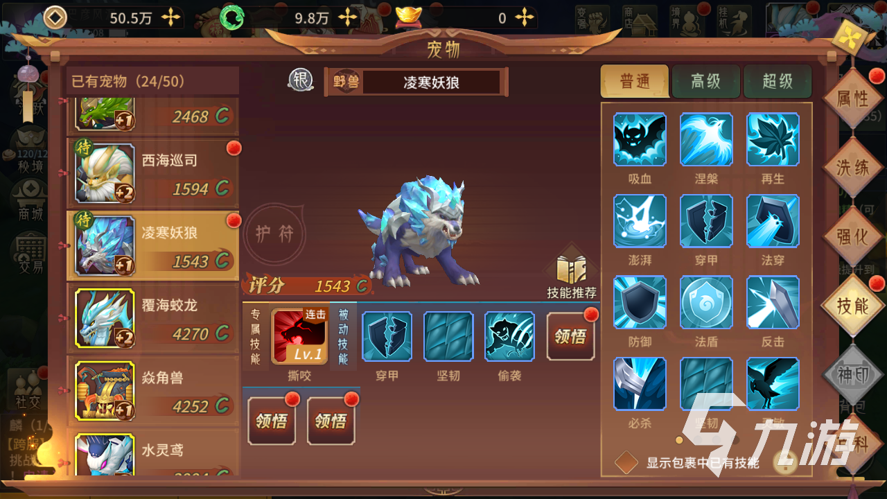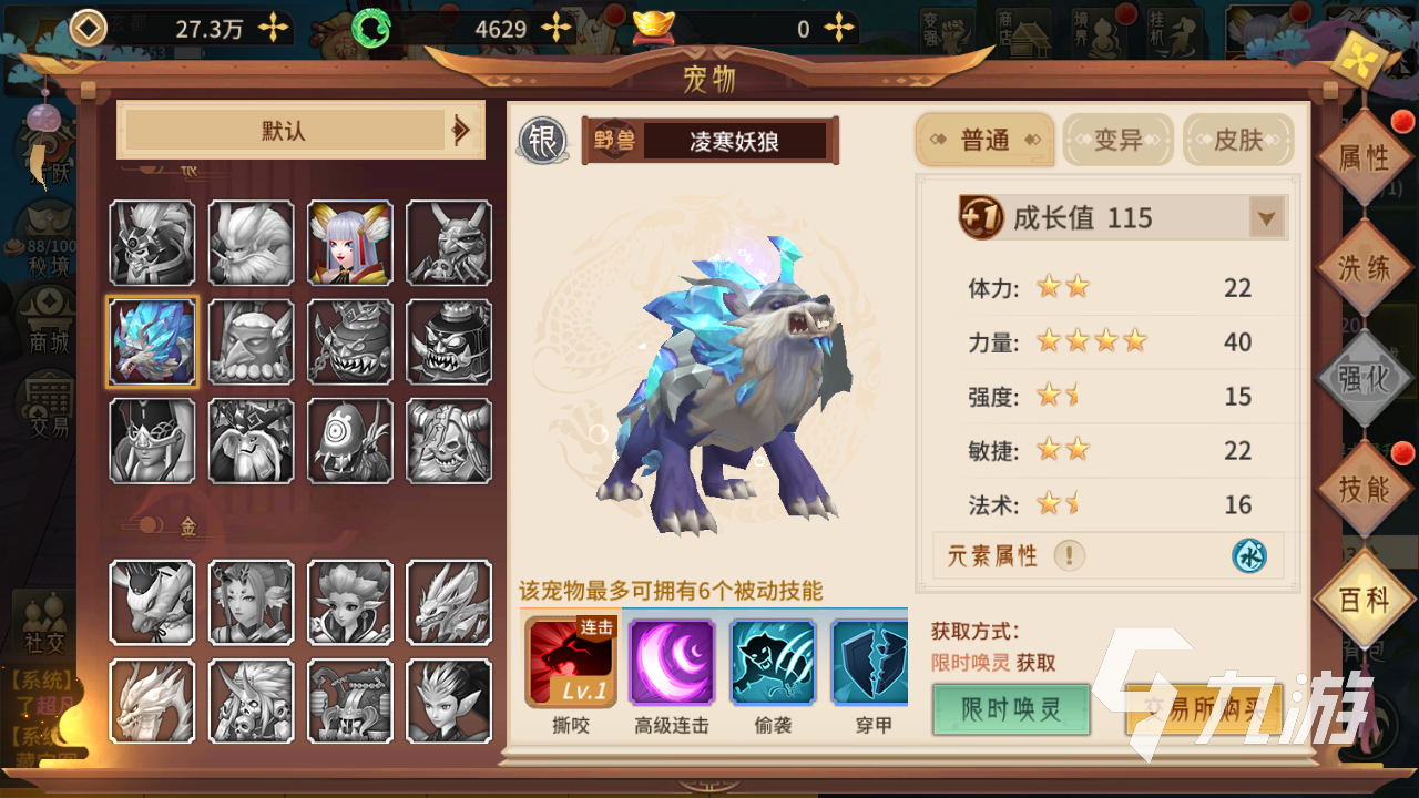 第一個(gè)就是凌寒妖狼,這個(gè)寵物的話算是力量寵物中比較不錯(cuò)的一個(gè)了,最高的力量點(diǎn)數(shù)可以達(dá)到四十點(diǎn),這個(gè)基礎(chǔ)算是比較不錯(cuò)的。在技能上妖狼也是帶有撕咬以及連擊的,其他技能的話獲取就看運(yùn)氣了。撕咬技能帶有不錯(cuò)額度單體攻擊能力,同時(shí)還會(huì)帶來流血的效果。連擊可以讓妖狼多次的進(jìn)行普攻,實(shí)戰(zhàn)中也是很容易觸發(fā)的。