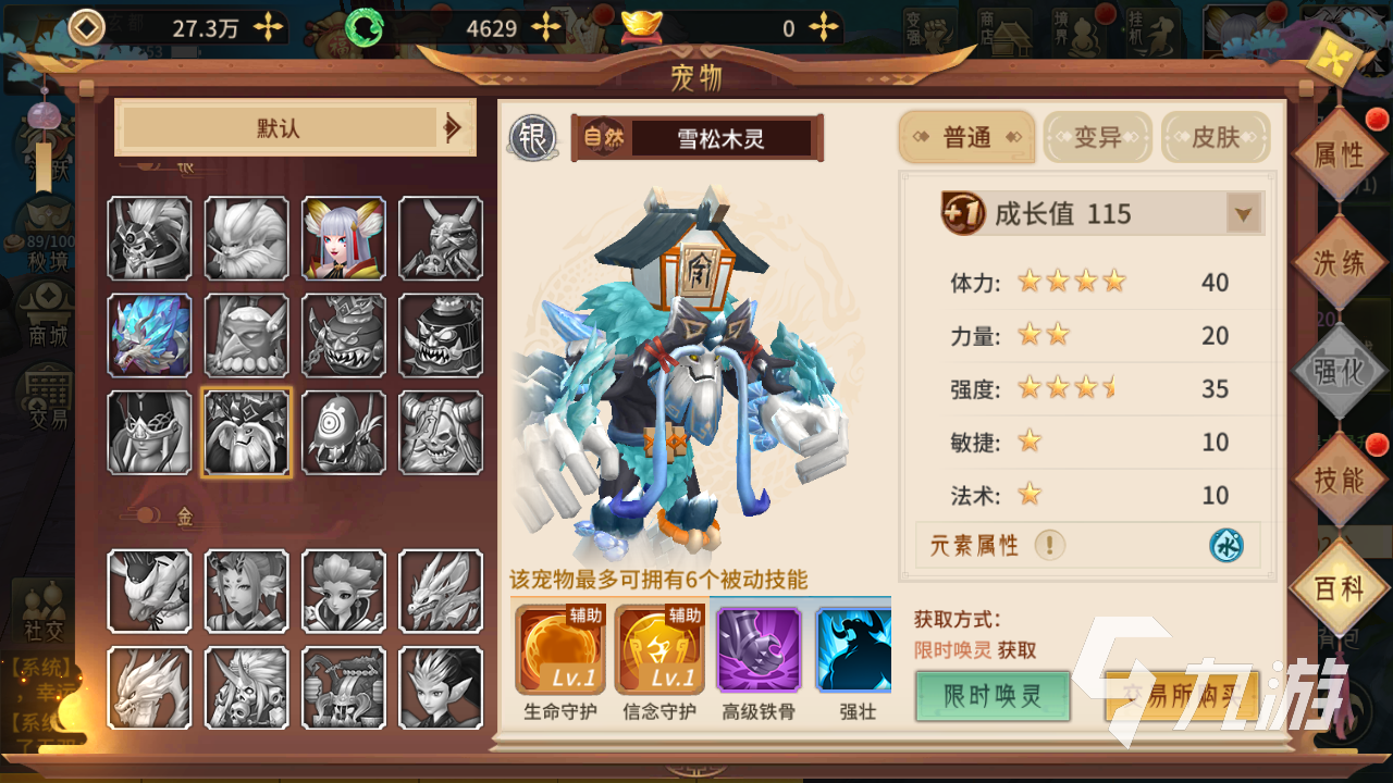 第四個(gè)推薦的是木靈這個(gè)寵物,該寵物是防御類型的, 體力值以及強(qiáng)度屬性都是不錯(cuò)的。技能生命守護(hù)可以帶來不錯(cuò)的恢復(fù)效果,信念守護(hù)可以降低目標(biāo)的法術(shù)傷害。