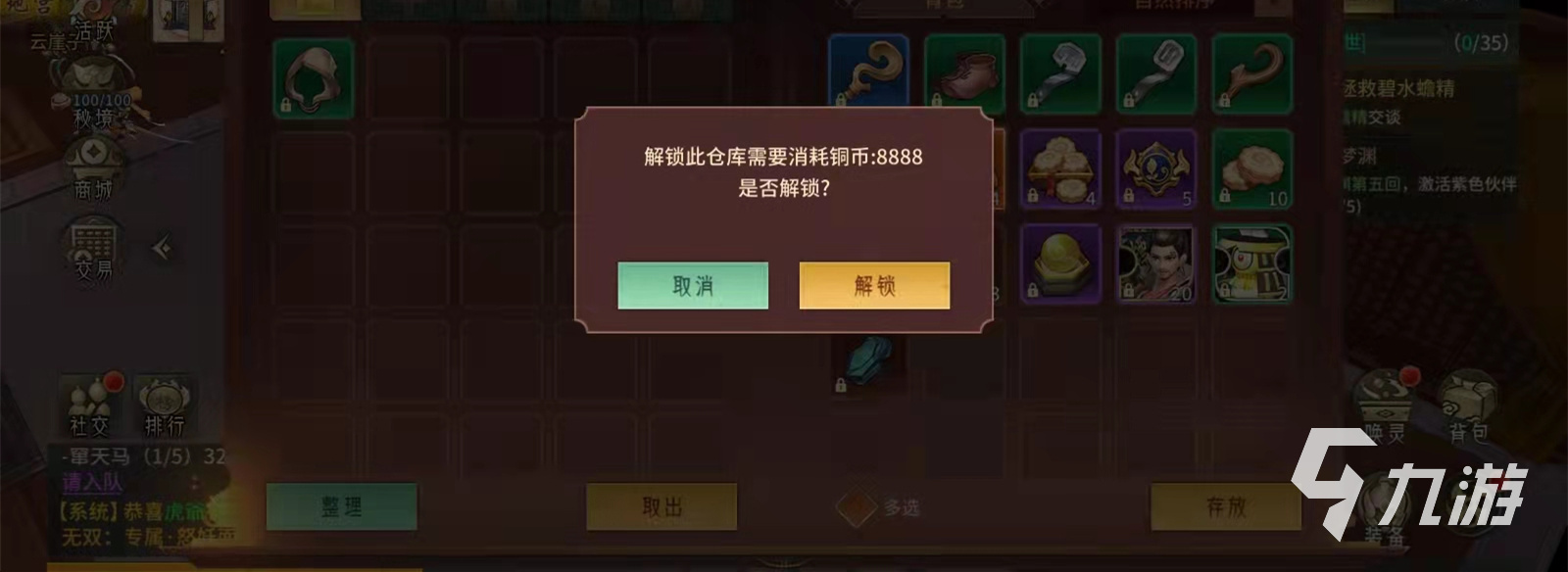 玩家可把背包里面的材料可以按照以下幾種方式進行存放,進行整理,自然排序,裝備優(yōu)先,圖鑒優(yōu)先以及寶石優(yōu)先,跟隨對應(yīng)的材料放在一起進行存放,沒有用的進行整理一下,然后進行存放,如果這樣整理完還是東西很多的話,可點擊小房子旁邊的加號按鈕,這時會提示解鎖此倉庫需要消耗銅幣8888是否解鎖。