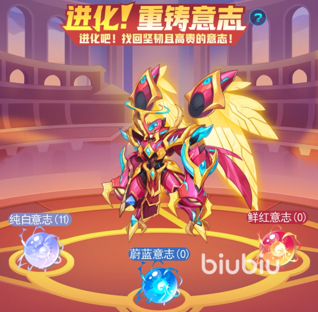 獲得了熔火拉斯之后,玩家就可以去進(jìn)化它。不過(guò)熔火拉斯不是靠升級(jí)來(lái)進(jìn)化成熔火天災(zāi)的,而是依靠[進(jìn)化!重鑄意志]這一活動(dòng)來(lái)將其進(jìn)化,玩家首先要獲得純白意志、蔚藍(lán)意志、鮮紅意志這三個(gè)晶石來(lái)得到,晶石要通過(guò)迷宮中的挑戰(zhàn)得到。
