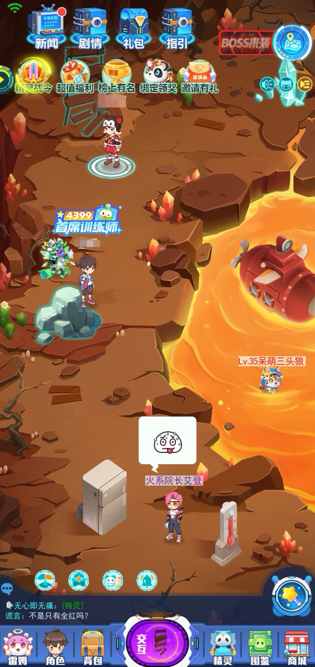 到了地幔后,玩家就可以看到呆萌三頭狼在巖漿中游來游去,玩家想要與它戰(zhàn)斗的話,就得先想辦法引起它的注意,這個方法也是很簡單的,只要從下圖所示的地方拿巖石砸呆萌三頭狼,當(dāng)砸到之后,就可以與它戰(zhàn)斗并捕捉到它了。