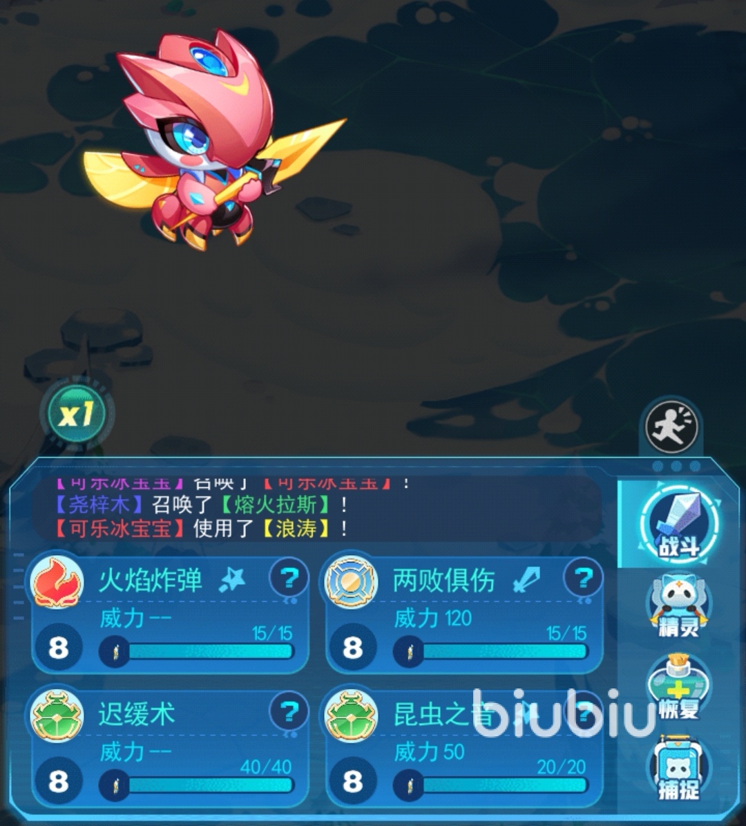 之后小編是使用21級(jí)熔火拉斯的火焰炸彈+昆蟲(chóng)之音+遲緩術(shù)這三個(gè)技能給可樂(lè)冰寶寶附加上燒傷與速度下降的debuff,并且讓其變成殘血,接著使用高級(jí)電池把它抓?。?/p>