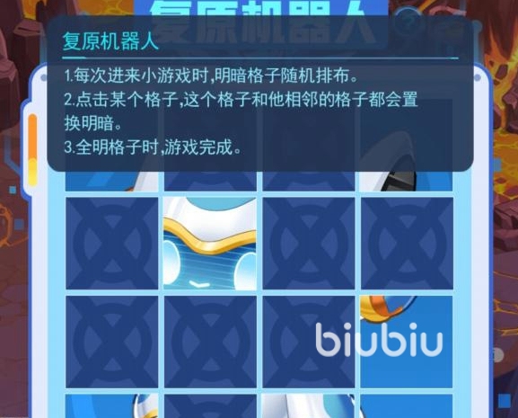 地系勛章的獲取方式簡單。首先,玩家打開第一張圖,點(diǎn)擊圓圓的標(biāo)志,等待其出來進(jìn)去,通過浮空術(shù)飛行過去,幫助小機(jī)器人復(fù)原。在進(jìn)行過程中,玩家注意游戲的規(guī)則,點(diǎn)擊某一個地方,讓旁邊的地方改變。當(dāng)玩家一步步復(fù)原機(jī)器人之后,在系統(tǒng)指引下,將前往第四張圖。