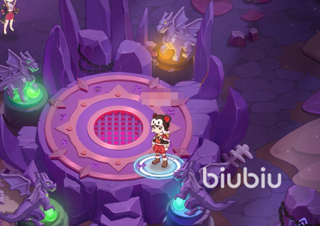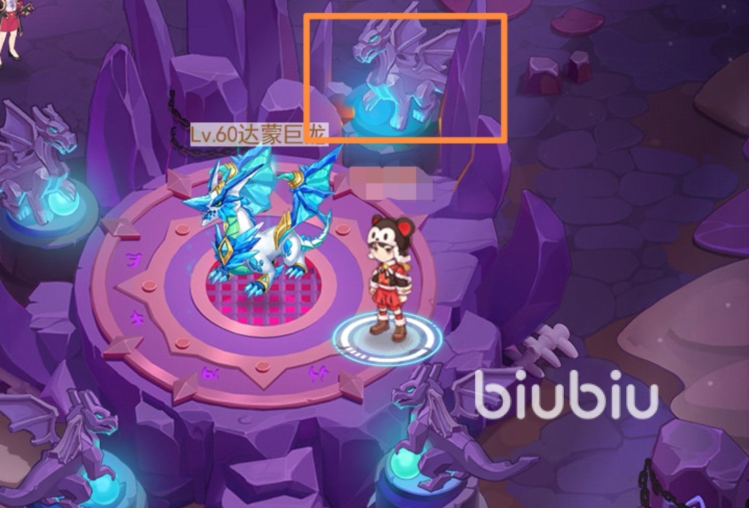 到達了黑暗龍淵后,玩家會看到如上圖所示這一片空地,周圍有四個龍雕像圍著,龍雕像守著一顆龍珠,只有點亮正確的龍珠才可以召喚出達蒙巨龍,正確的龍珠是小編在下圖圈出的這一顆。