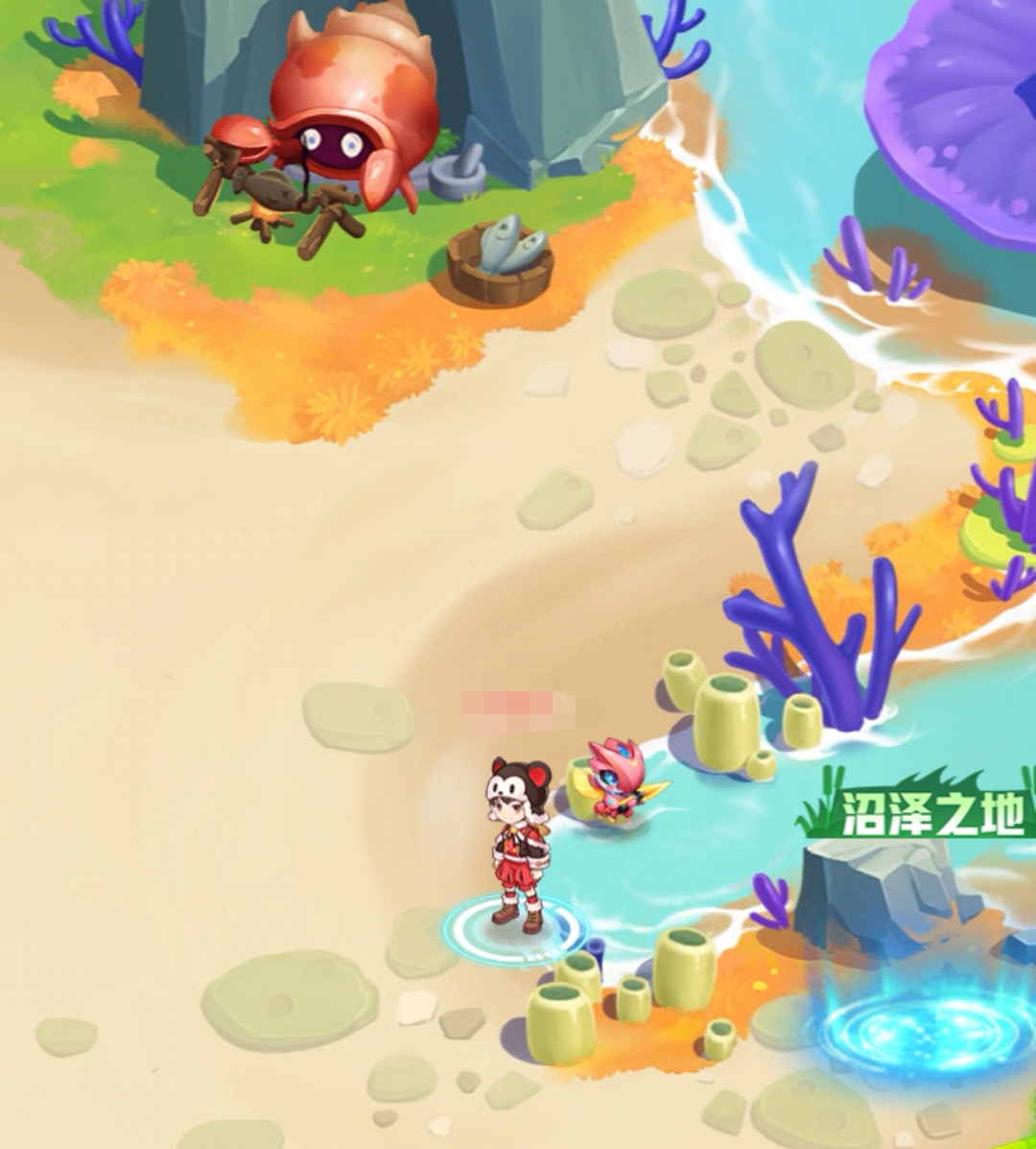 方法一、從彩虹珊瑚島前往,玩家需要去維克海灘中,選擇[當(dāng)前區(qū)域]的地圖,接著點(diǎn)擊彩虹珊瑚島,當(dāng)玩家到達(dá)這一地點(diǎn)后,玩家會(huì)看到有一只正在玩火的寄居蟹,就在這只寄居蟹的右下角便是沼澤之地了,玩家點(diǎn)擊進(jìn)入就可以前往啦!