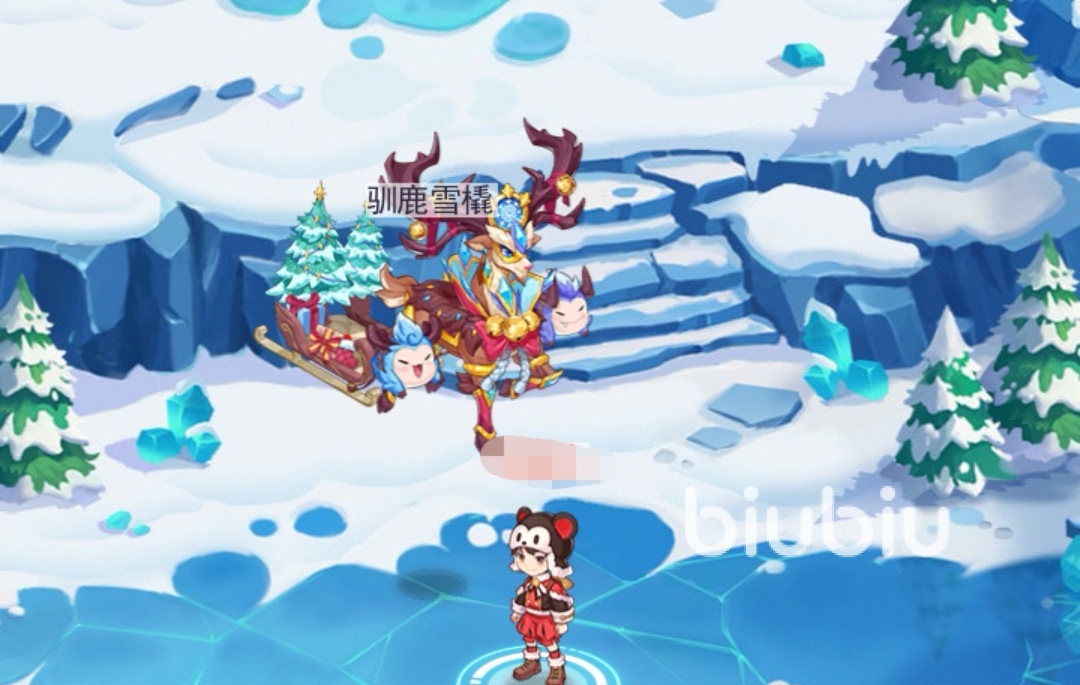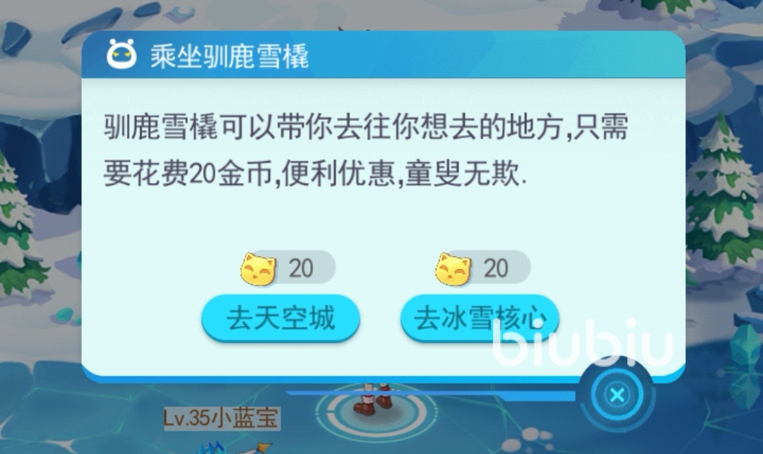 其中冰雪核心這個(gè)地方玩家不能直接從可樂(lè)冰小鎮(zhèn)進(jìn)入的,需要擁有冰系徽章或者乘坐雪橇進(jìn)入,前者是不現(xiàn)實(shí)的,因?yàn)楸祷照轮挥羞M(jìn)了冰雪核心才能獲得,所以玩家只能做馴鹿雪橇前往,雪橇的位置是在如下圖所示。玩家想去冰雪核心的話,只需要花費(fèi)20塊金幣,還蠻方便的。