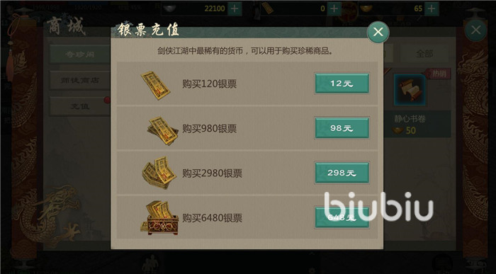 此外在奇珍閣中還可以使用銀票來(lái)購(gòu)買(mǎi)物品,銀票也可以直接充值獲得。玩家可以將刷到的裝備或者秘境放在奇珍閣出售,也可以和玩家自由交易換取銀票或者金幣。