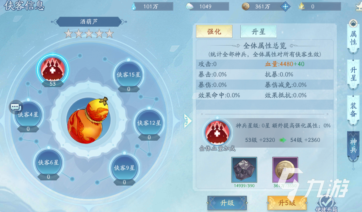 在右側(cè)上方這里可以看到神兵的屬性總覽,屬性加成還是比較多的, 有攻擊、血量、暴擊、爆傷、抗暴、效果命中以及效果抵抗這些。這些屬性都是全體的屬性加成,所以說帶來的收益也是非常不錯的,將所有橙色俠客神兵提升起來之后,收益非常大。