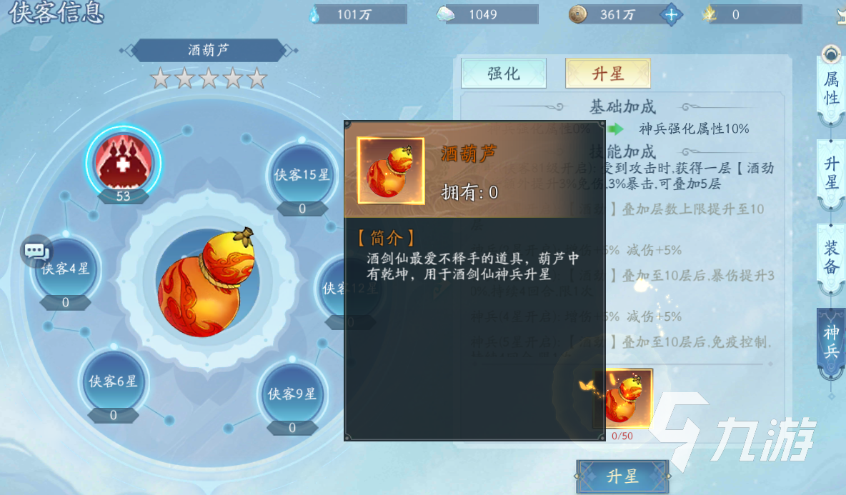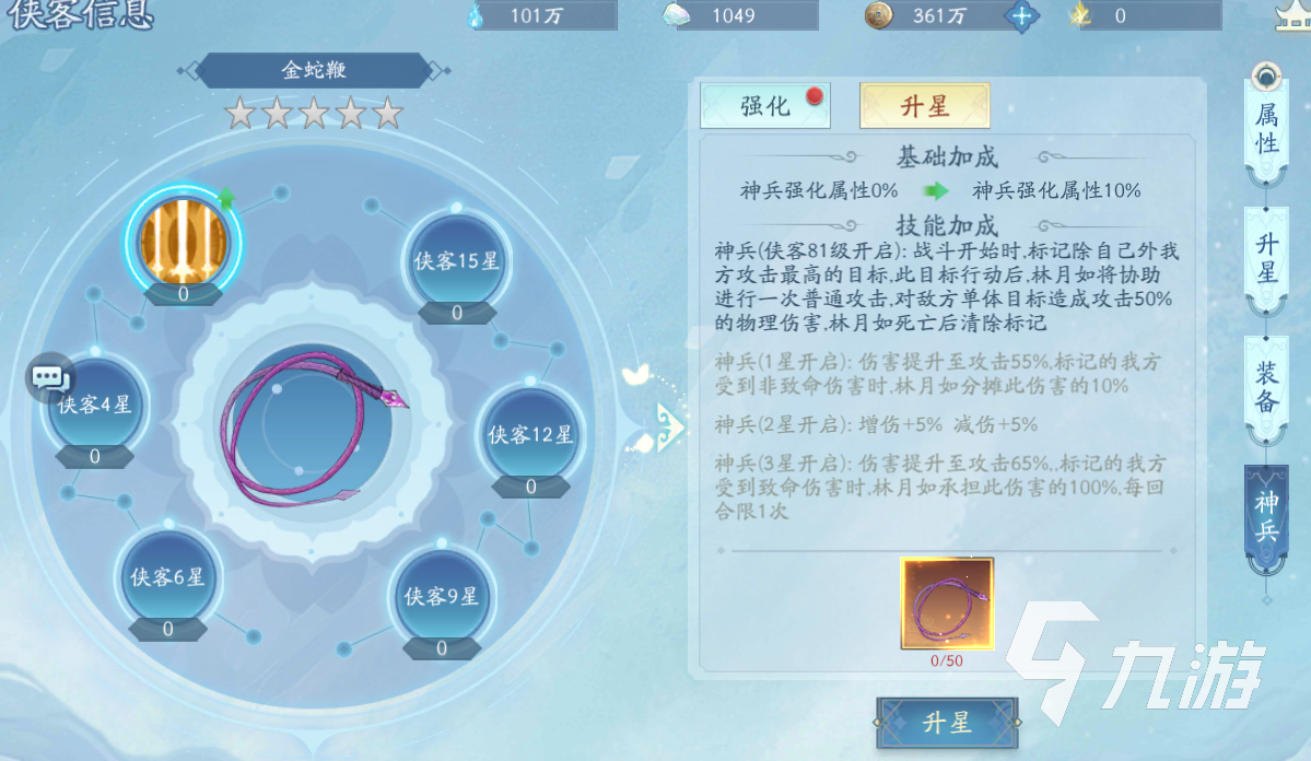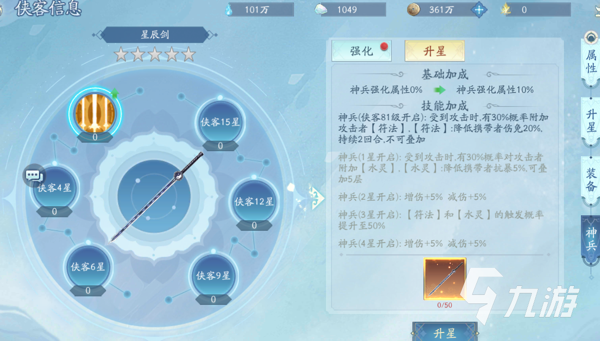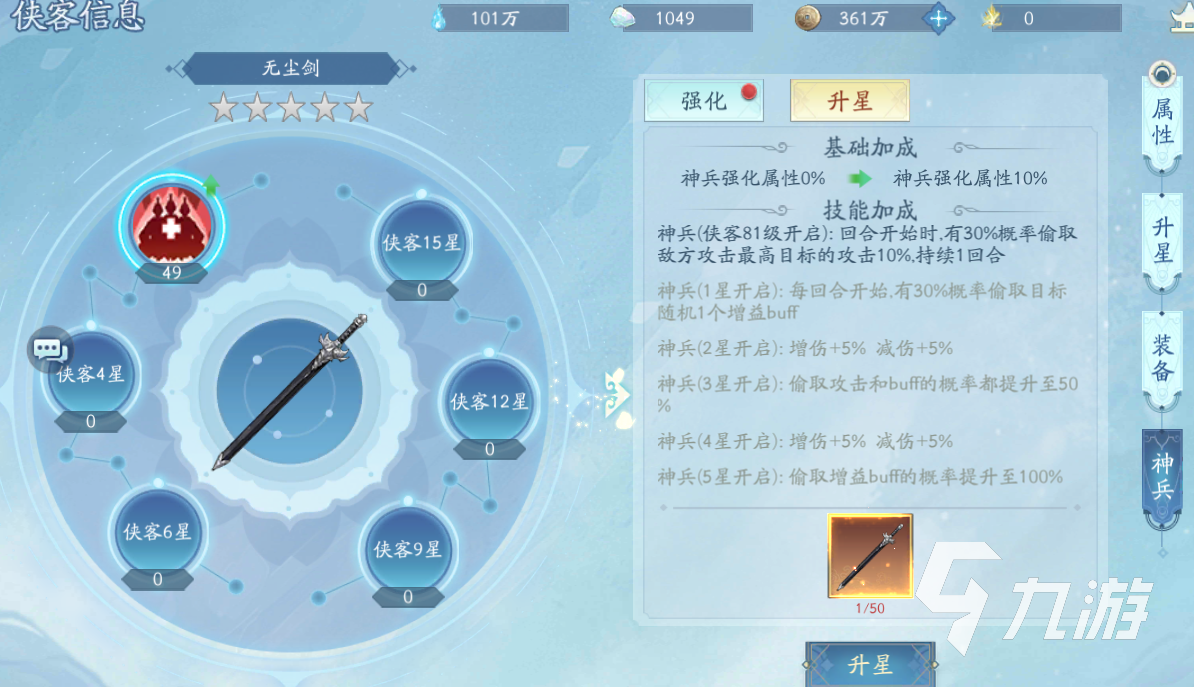 除了技能的提升之外,神兵還可以通過升星來進行能力的提升。點擊上方強化旁邊的升星按鈕進入到升星界面中,這里需要花費對應(yīng)的神兵碎片來進行提升。每次都要消耗五十個神兵碎片,獲取方式可以通過商店購買和一些道具箱子來獲得。隨著神兵星級的提升,可以獲得一些額外能力的加成。這些能力只有當(dāng)前俠客可以吃到,和屬性還是有一定區(qū)別的。