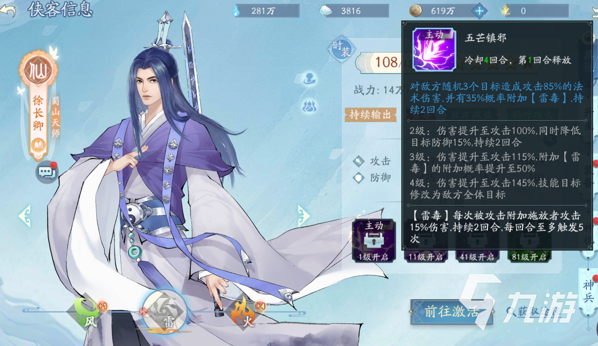 先來看一看技能,“五芒鎮(zhèn)邪”這個(gè)技能會(huì)隨機(jī)的攻擊敵人三個(gè)目標(biāo),在造成傷害的同時(shí)會(huì)有幾率附加雷毒。雷毒會(huì)在敵人受到傷害的時(shí)候附加外額外傷害。徐長卿的攻擊力越高,實(shí)戰(zhàn)的效果也就越好的。隨著技能等級(jí)的提升,附加幾率也會(huì)增加,同時(shí)技能變成全體的一個(gè)攻擊機(jī)制。